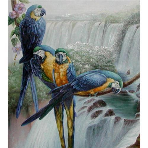 A BEAUTIFUL AND LARGE OIL PAINTING OF FOUR BLUE & GOLD MACAW PARROTS AT IGUAZU FALLS, ARGENTINA</em></td>
