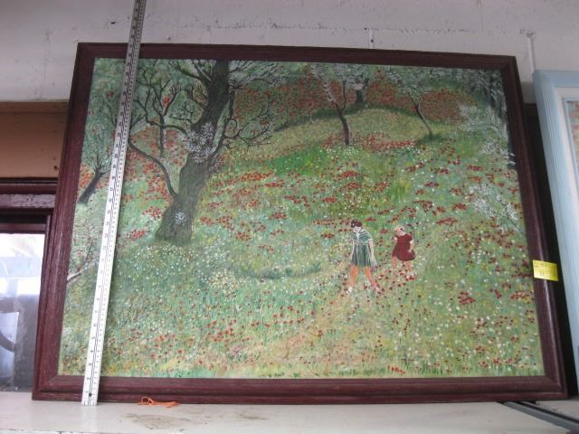 LG. ORIGINAL FRAMED PAINTING, "THE GIRLS WALKING THROUGH THE FLOWERS" BY H. FOSTER