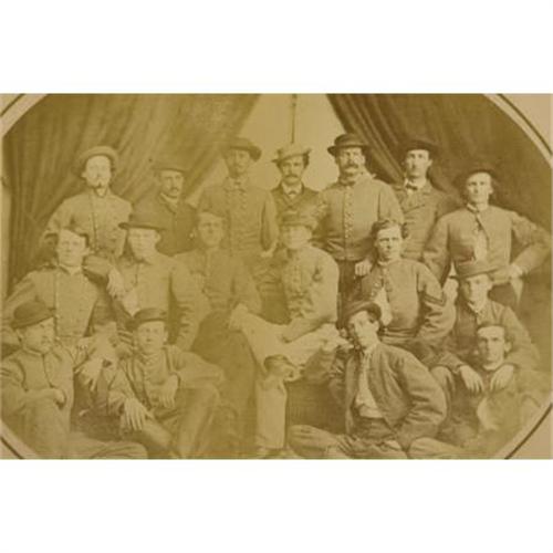 <B>CONFEDERATE ARMY 43RD BATTALION, “MOSBY’S RANGERS” MAMMOTH PLATE PHOTOGRAPH 1863.</B></I> John Singleton<I> </B></I>Mosby<I> </B></I>(December 6, 1833 - May 30, 1916), also known as the "Gray Ghost," was a Confederate partisan Ranger (a partisan is similar to a guerrilla fighter) in the American Civil War. He was noted for his lightning quick raids and his ability to successfully elude his Union Army pursuers and disappear (like a ghost) with his men, blending in with local farmers and townspeople. The 43rd Battalion, Virginia Cavalry, also known as Mosby’s Rangers<I> </B></I>or Mosby’s Men, was a battalion of partisan cavalry in the Confederate army. Noted for their lightning strikes on Union targets and their ability to consistently elude pursuit, the Rangers disrupted Federal communications and supply lines. The 43rd Battalion was formed on June 10, 1863, at Rector's Cross Roads, near modern day Atoka, Virginia, when John S. Mosby formed Company "A" of the battalion, under the authority of General Robert E. Lee, which had been granted in January 1863, following authorization for such units by the Confederate Congress in April 1862. By the summer of 1864, Mosby's battalion had grown to six cavalry companies and one artillery company, comprising about 400 men. After February 1864, the Confederate Congress revoked the authority of all partisan units, except for two, one of which was the 43rd Battalion. The battalion never formally surrendered, but was disbanded on April 21, 1865, after General Lee surrendered the Army of Northern Virginia at Appomattox Court House, but not before attempting to negotiate surrender with Major General Winfield S. Hancock in Winchester, Virginia. <BR><BR>Photograph taken at Richmond. Front Row, left to right: Walter W. Gosden, Harry T. Sinnott, Otho L. Butler, Isaac A. Gentry. Middle Row, left to right: Sergeant Robert B. Parrott, Thomas Throop, John W. Munson, <I>Colonel John Singleton Mosby</B></I>, Alphonso M. Newell, Charles H. Quarles. Top Row, left to right: H. Lee Howison, Lieutenant W. Ben Palmer, Lieutenant John W. Puryear, Sergeant Thomas Booker, Sergeant Alexander G. Babcock, Norman V. Randolph, Lieutenant Frank H. Rahm. <BR><BR>This is a very impressive mammoth plate photograph (large imperial size photo card), approximately 22” x 19”, the oval image measures 16.75” x 13.25”. Large format Confederate photographs are extremely rare. The card has scalloped gilding on border. <BR><BR><B>Condition:</B></I> Very good to fine, some fading in center of image. <BR><BR><b>Shipping:</b> Framed - with Glass, Medium (<a target="_blank" href="http://www.heritageauctions.com/common/shipping.php">view shipping information</a>)
