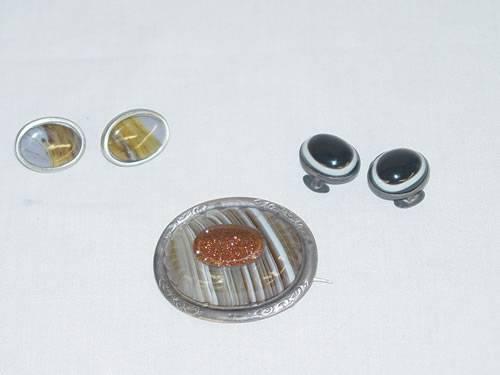 LG. STERLING AGATE and GOLDSTONE PIN and 2 PAIRS OF AGATE CUFFLINKS;