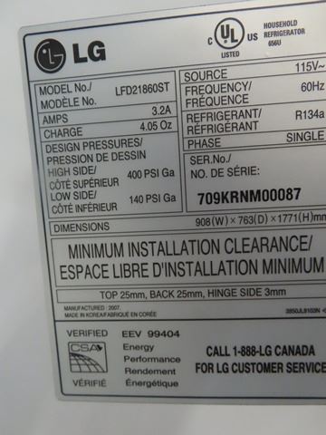 LG Stainless Steel Fridge Side x Side w Bottom Freezer 70" H 36" W 26" D