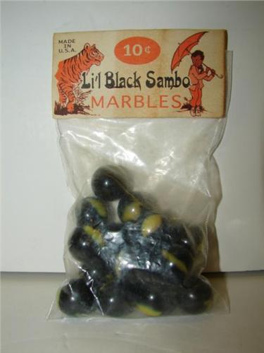 BAG OF LI’L BLACK SAMBO MARBLES. Bag of black and yellow marbles with label at top that reads “10¢/Li’l Black Sambo/Marbles” and shows a tiger with an African-American boy with umbrella.