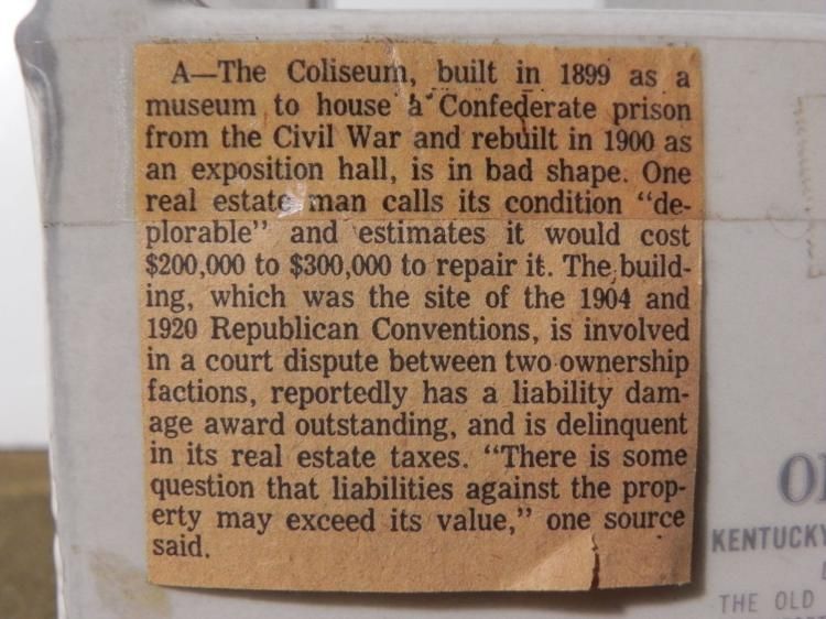 LIBBY PRISON FOR CONFEDERATE PRISONERS-OLD TAYLOR DECANTER W/CLIPPING ON BACK * INTERESTING 8X9X3 1/2" DECANTER OF THE LIBBY PRISON WAR MUSEUM-ORIGINALLY HOUSED CONFEDERATE PRISONERS WITH OLD NEWSPAPER CLIPPING ON BACK EXPLAINING DIS-REPAIR & COST TO REMAIN OPENED--TALL TURRET HAS TOP CAP--EMPTY DECANTER *