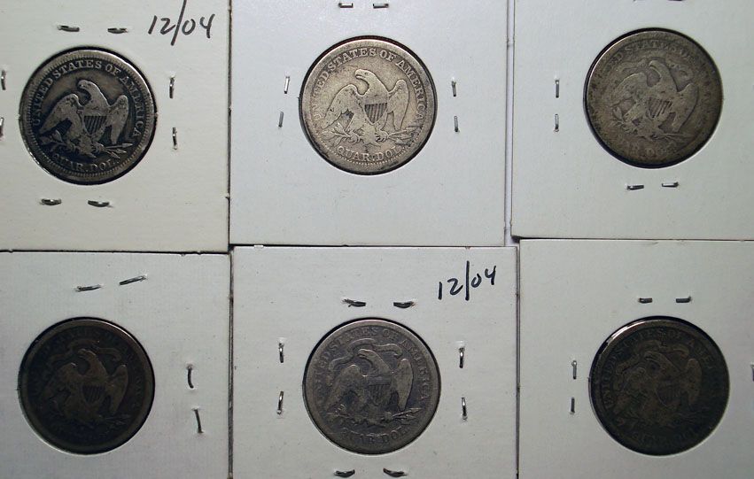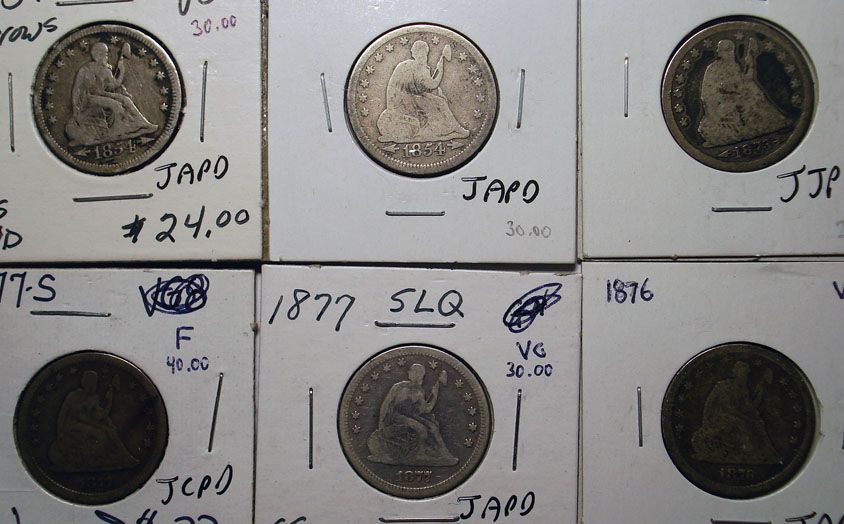 LIBERTY SEATED QUARTERS:1854 VG, 1854 G,1873 ARROWS AG, 1877-S VG,1877 VG,1876 G