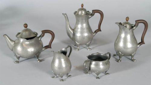 LIBERTY TUDRIC PEWTER TEA SET, 5 pieces, largest 8" high, 1/2 pints, circa 1900, CONDITION: lid to smaller pot ill-fitting due to body being bent, PACKING AND SHIPPING BY FAIRFIELD AUCTION WITHIN CONTINENTAL USA (excluding insurance) $35,