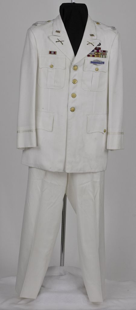 Army lieutenant colonel's summer uniform includes tunic and trousers, the tunic bearing silver oak leaf pin-on rank insignia with U.S. and crossed-rifle infantry brass, parachute badge and C.I.B., 2nd Award, with ribbons including three Bronze Stars, Purple Heart, Vietnam Campaign with three stars, and Army Valorous Unit Award.