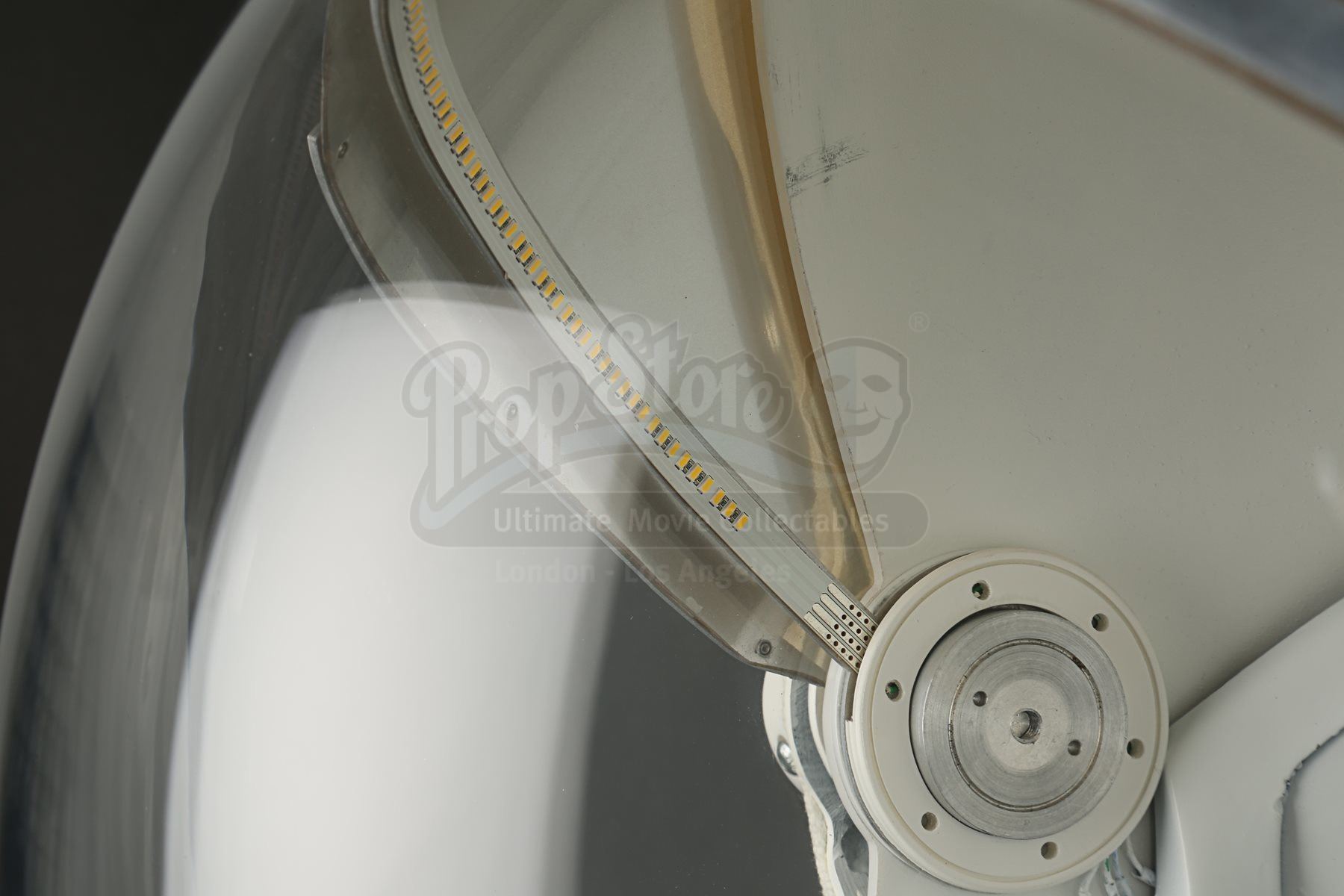 The helmet consists of an ABS plastic frame covered in a white canvas-like material. It features a spherical clear-plastic visor with a faux-gold sun visor and adjustment dials on either side. Mounted on a custom-made display, the helmet has three metal fixtures housing lights across the top. A switch on the display base illuminates the lights, powered by three AA batteries. The headpiece shows minor wear from production use, including surface scratches on the visors and small stains on the white fabric. Dimensions (displayed): 42 cm x 43 cm x 54 cm (16 ½” x 17” x 21 ¼”)