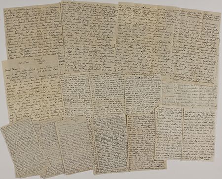 A fine archive of letters by "Anna", a British farmer residing in Sellindge, Kent, during the Blitz, 1940-1942, each penned to Eleanor Wignall in Doyleston, Pa. The archive comprises approx. seven lengthy and highly detailed letters about the German bombing of England, rationing, and other aspects of the war. In very small part: [Sept. 6, 1940] "...Slews of Jerries have come in & the siren has gone. About 70 bombers with quite a hundred messer's. It is a very awesome sight I can assure you to see those bombers come in over the farm from the marsh like this, just a long straight line. One feels it would be easy to take a pot shot at them...At first they used to send bombers in formations of 7 or 17...The marsh side of my house...is the fighting zone. East side...defence zone. The latter puts up terrific barrage - words cannot describe it...I saw the shell bursts [sic] in the sky...they meet the defence guns better [censor has cut word out] & on way to Thames Estuary...One boy came down was shot by a Messer pilot as he was sailing down so defenseless, it is impossible for them to help themselves...Another was riddled with bullets...it was heartbreaking to watch...Yesterday my windows seem to go all day as they blew up the bridges over the canal down in [excised] & on marsh..., and much more. Anna continues on Oct. 23, 1940: "...It did not seem possible that life could go on pretty much as usual regardless of vast hordes of planes assaulting us at intervals...It says much for our Air Force lads & much, very much, for those brave people who sustained the onslaught. Our pretty little Hythe [?] and towns in immediate vicinity have had much bombing lately the result or proof should I say of the failure of Hitler's minions...; [Dec. 4, 1940] "...Just heard old Haw Haw on the 7:40 news. According to him we are absolutely finished. If so why does he work himself up...His blase manner should accompany such news not hysteria....Still I do believe we are having a hard fight. Our industrial towns have a ? one night each week of bombing and only the fact that they have expected such nocturnal visits has saved this dear Isle from being wiped off the map...but the Turn of the Tide has come. Roosevelt sitting another term has been a very big gain for Democracy...In the land of Dictator's opponents usually go to concentration camps...By Grace of God our little Island is still British much to Hitler's Chagrin...". Much more content! Very good condition.