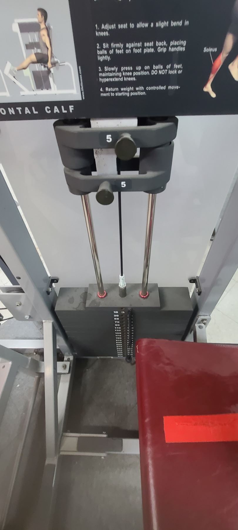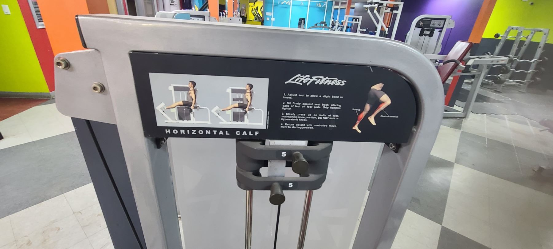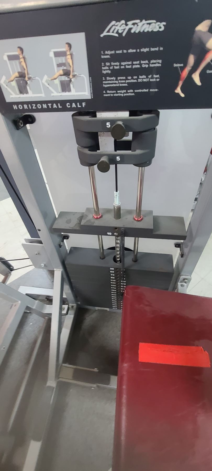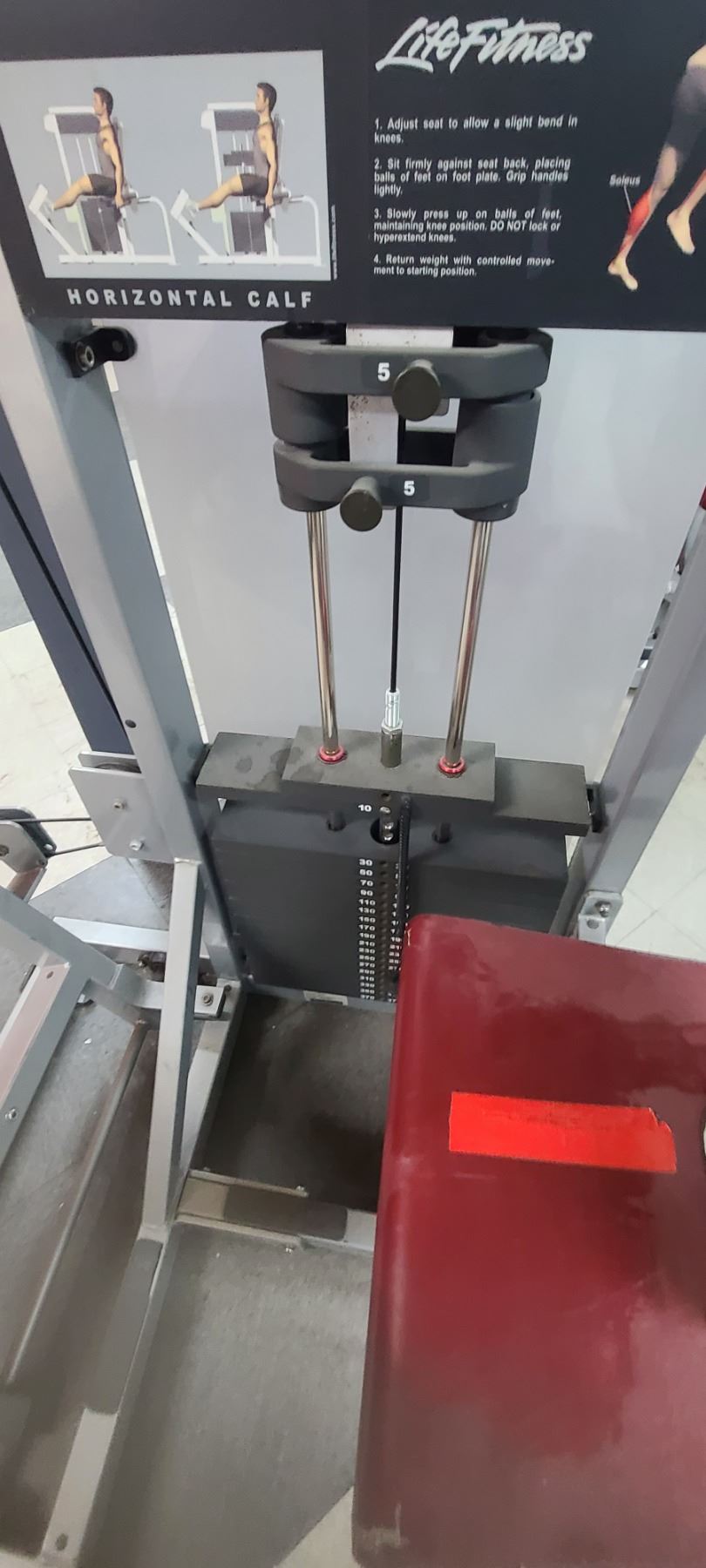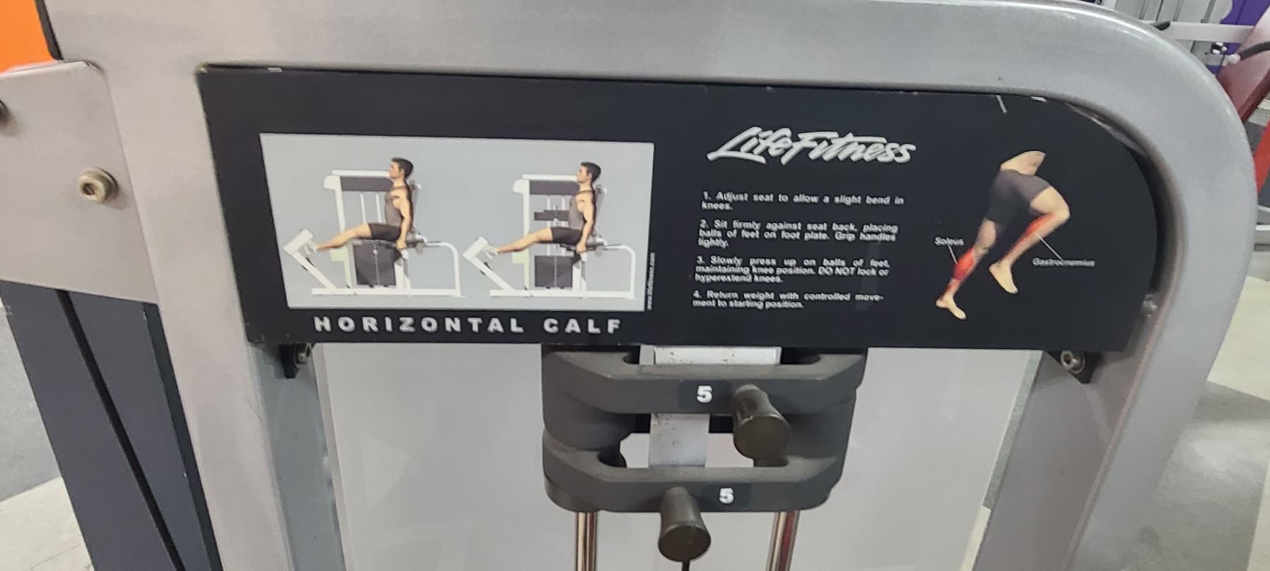 LIFE FITNESS HORIZONTAL CALF MACHINE. *NOTE*: NOT ON MACHINE SAYS OUT OF ORDER: HOWEVER IT APPEARS IN WORKING ORDER - THERE IS SHARP/SHEERED BOLT WHERE THE WIRE MEETS THE WEIGHT- PLEASE SEE IMAGES WHERE IT IS POINTED OUT
