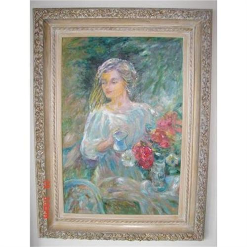 Louis Boucher--20TH. Century European Artist. Listed in Davenport. This is a Life Size Very Impressionistic Oil on Canvas of A Lady In a Garden watering her Flowers. Colors are Vivid. Many Colors of yellow, blue,green,red and off white. Total Dimensions including frame is 35" X 46". Great painting for a Large Room that needs a Full Size painting with great colors.