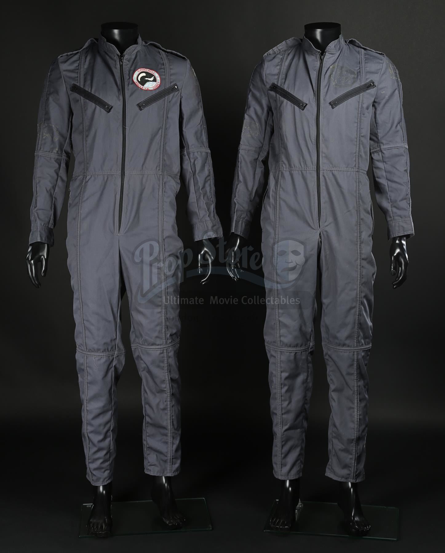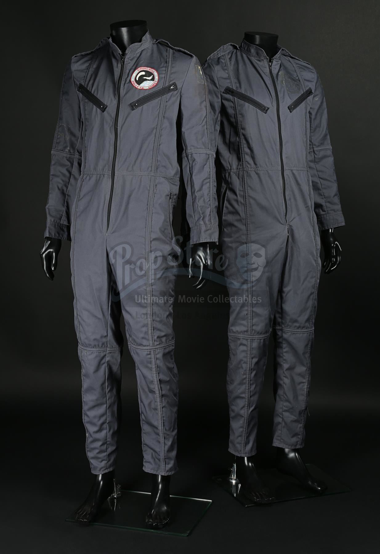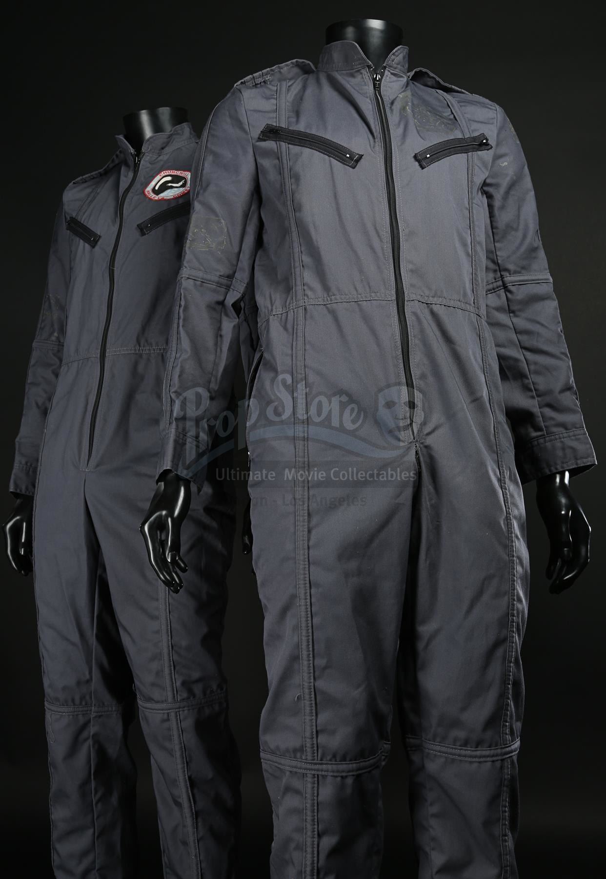 Made of dark grey cotton, the flight suits - both marked as size 40' chest - have faux pockets on the chest and rear, with zip closures along the front and hip pockets. One of the flight suits has a Churchill shuttle crew patch on the left breast. A screen-printed Churchill crew patch, trimmed in red cotton embroidery, is also included. The set displays some minor wear, with glue marks on the flight suits indicating areas where other patches were secured for filming.