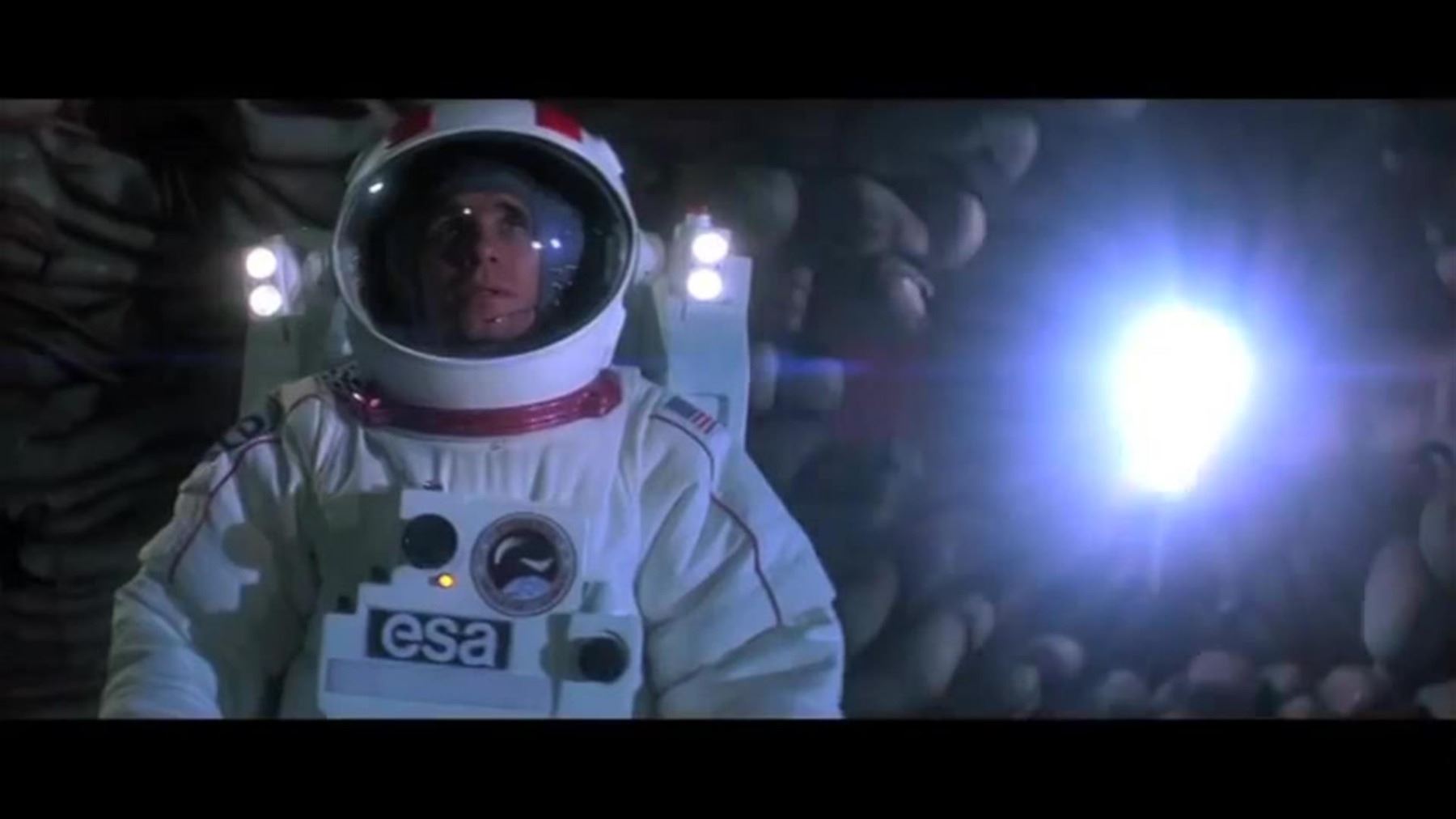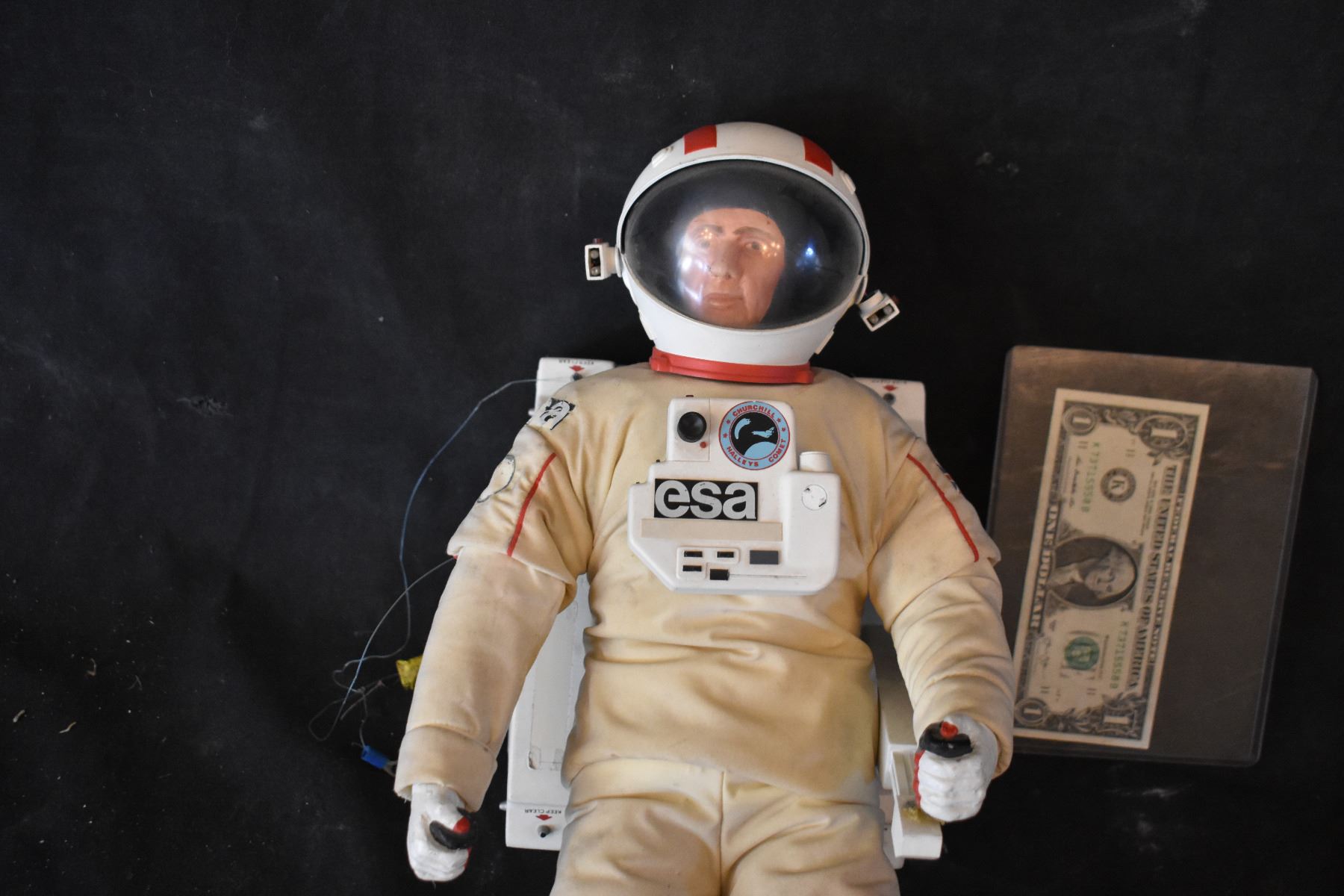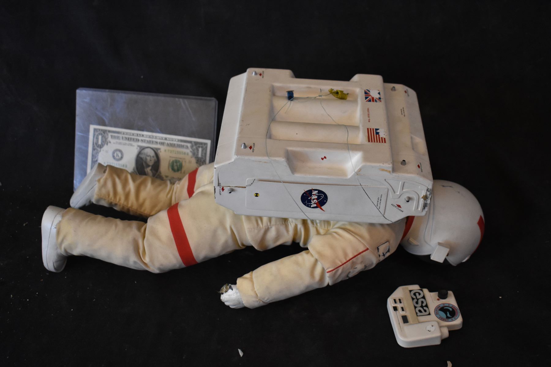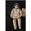 Incredibly detailed 19 x 8 x 9 in. astronaut puppet constructed of cast resin components on metal armature with hinged arms. Expertly painted and dressed in full fabric spacesuit and cast resin helmet with clear visor and chest panel. Attached to a resin jet pack with control arms. The figure retains stickered labeling on costume and jetpack to achieve detailed realism. Used for filming the alien ship expedition when space vampires are first discovered.