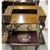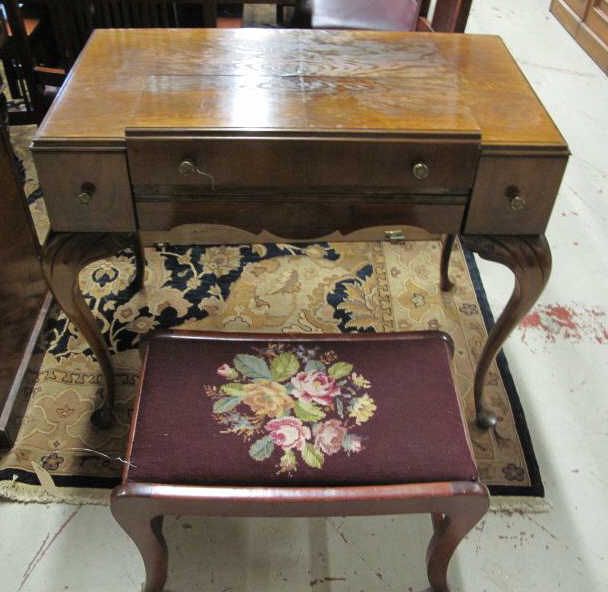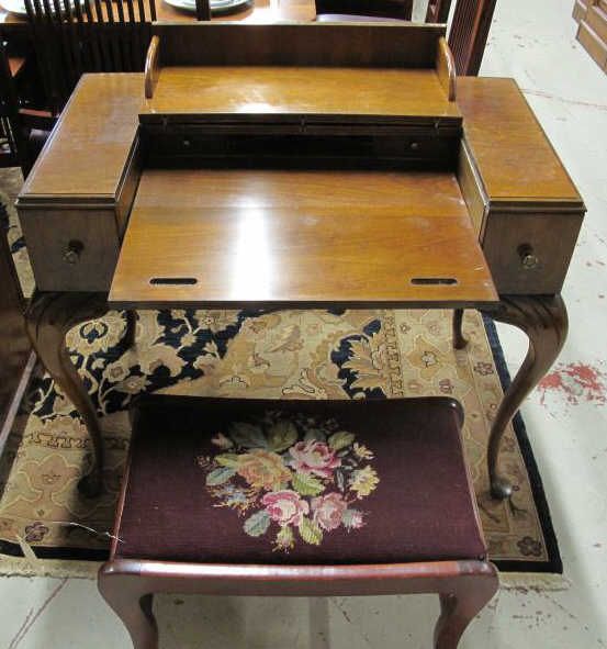 -lift top desk with two inserts, cabriolet legs. With matching needlepoint stool.