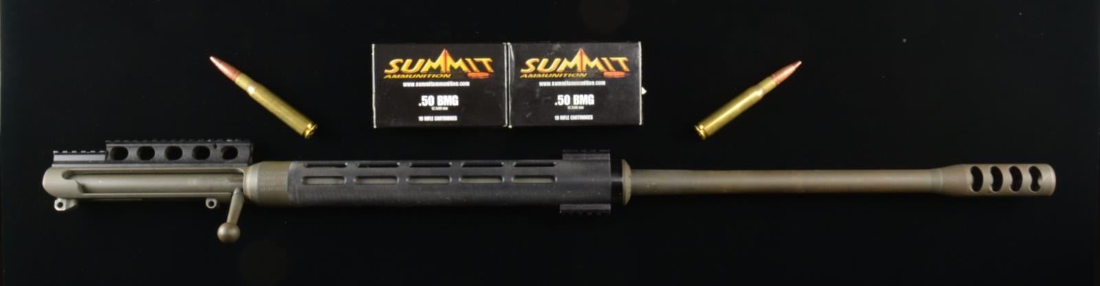 Cal. 50 BMG. S# 07-0275. Bbl. 29". A single shot bolt action upper receiver chambered in 50 BMG, Muzzle is terminated w/ a 5" brake. 14" Knurled aluminum hand guard w/ 2" rail sections mounted at muzzle end at 12:00 & 6:00. 6" High rise picatinny rail for optic mounting complete w/ proprietary hammer & spring which must be installed in your lower prior to use. Parkerized finish on all exposed steel surfaces. UNATTACHED ACCESSORIES: 2 boxes 20 rds of 643 gr. M17 Summit Tracer. CONDITION: finish on all exposed surfaces still enjoys complete coverage w/ thinning at points of mechanical intervention. Bbl. & handguard poses normal, gentle rack wear typically associated w/ vertical storage. Bore is shiny w/ strong rifling. (02-15327/JZ). NON-GUN. $900-1,400.