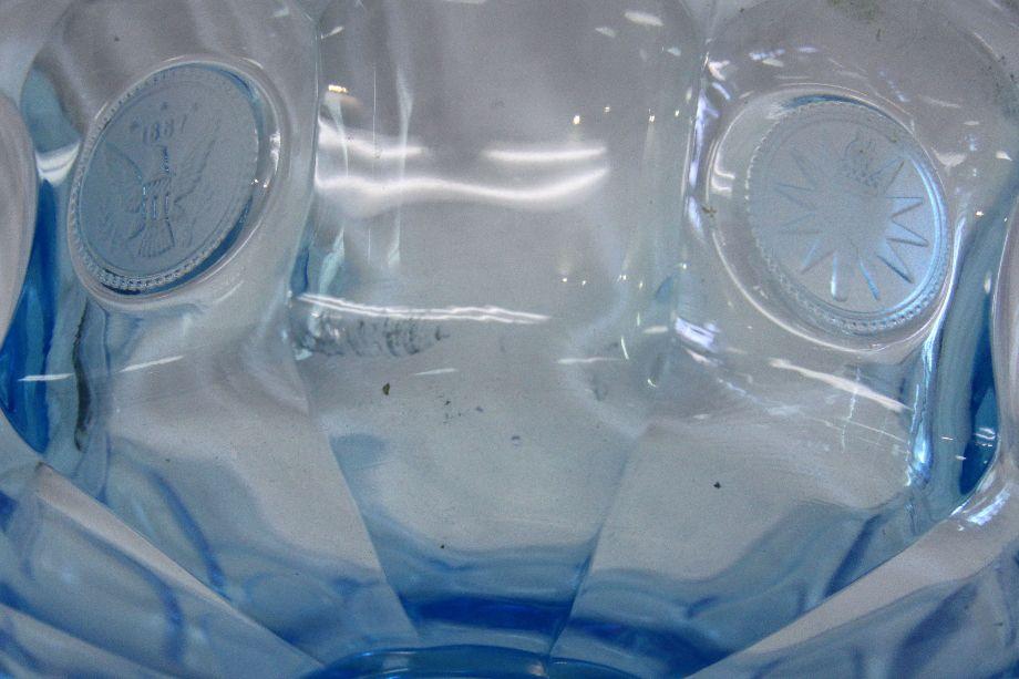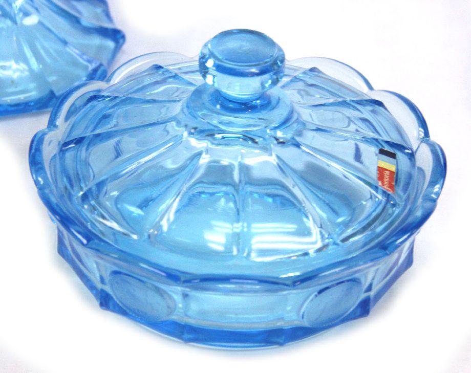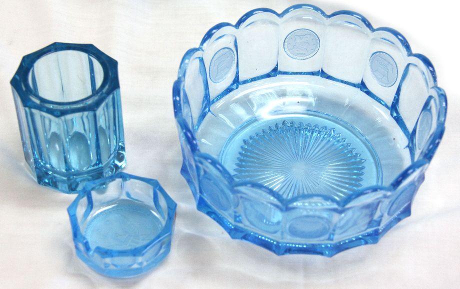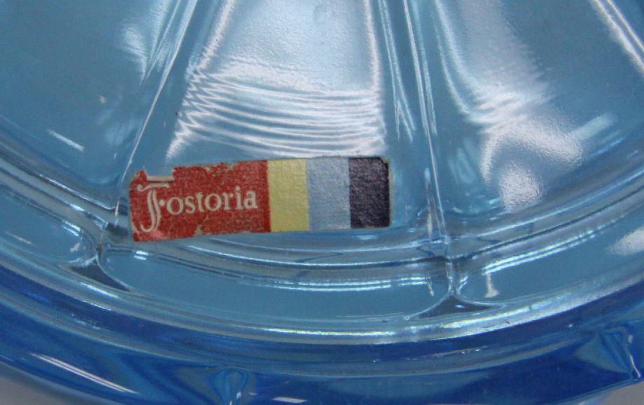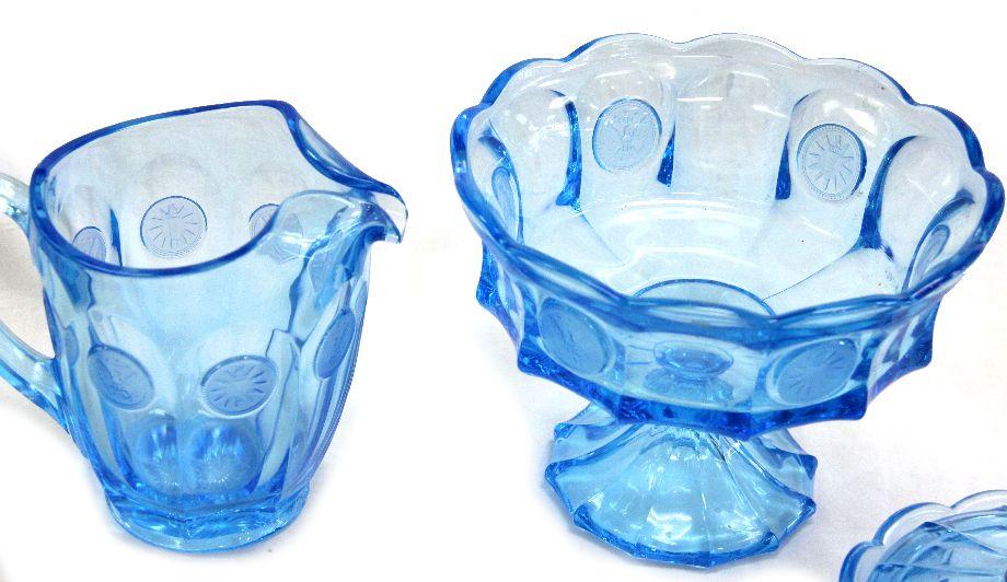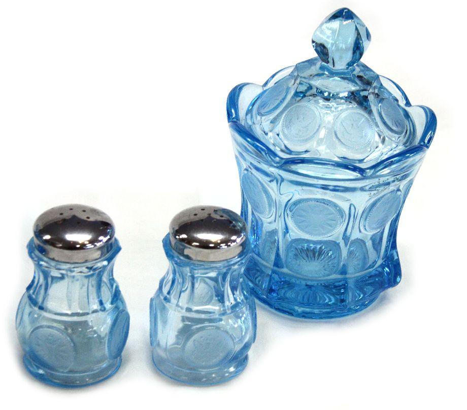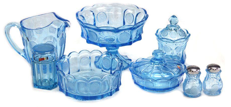 A good collection of light blue Fostoria Coin pattern glassware, including: 6.5 inch footed compote, 6 inch pitcher, 6 inch lidded jar, 3 inch salt and pepper shakers, 3.5x7.5 inch bowl, 2x7 inch lidded bowl, and a 4.5 inch cigarette holder with ashtray lid. Very good condition with a small scuff to compote.