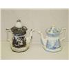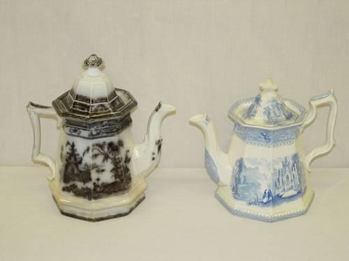 LIGHT BLUE TRANSFER WARE TEAPOT - COLUMBIA PATTERN - OLD REPAIRS and DAMAGE, TOGETHER W/ A MULBERRY TEAPOT W/ MISMATCHED LID - COREAN PATTERN;