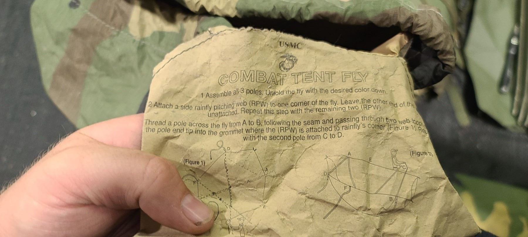 LIGHT WEIGHT EUREKA - MARINE COMBAT TENT - WOODLAND CAMO. APPEARS TO ALL BE EVERYTHING NEEDED - GROUND , TENT, COVER, POLES, PEGS. MADE IN USA