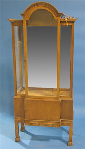 LIGHTED CURIO CABINET. Carved Greek key design around bottom and paw feet. Dome top. Mirrored back. Blind door at bottom. Glass door at top. Has no shelves. 67.75" H, 31" W, 13.5" D