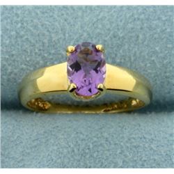 In 10K Yellow Gold. Contains a natural 7x5mm oval shaped amethyst gemstone with a bright purple bright color and excellent clarity. Size 5. 1.8g