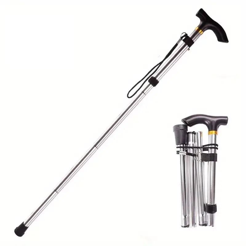 WALKING STICK/CANE WITH RUBBER HANDLE. FOLDS TO 11 INCHES. SILVER