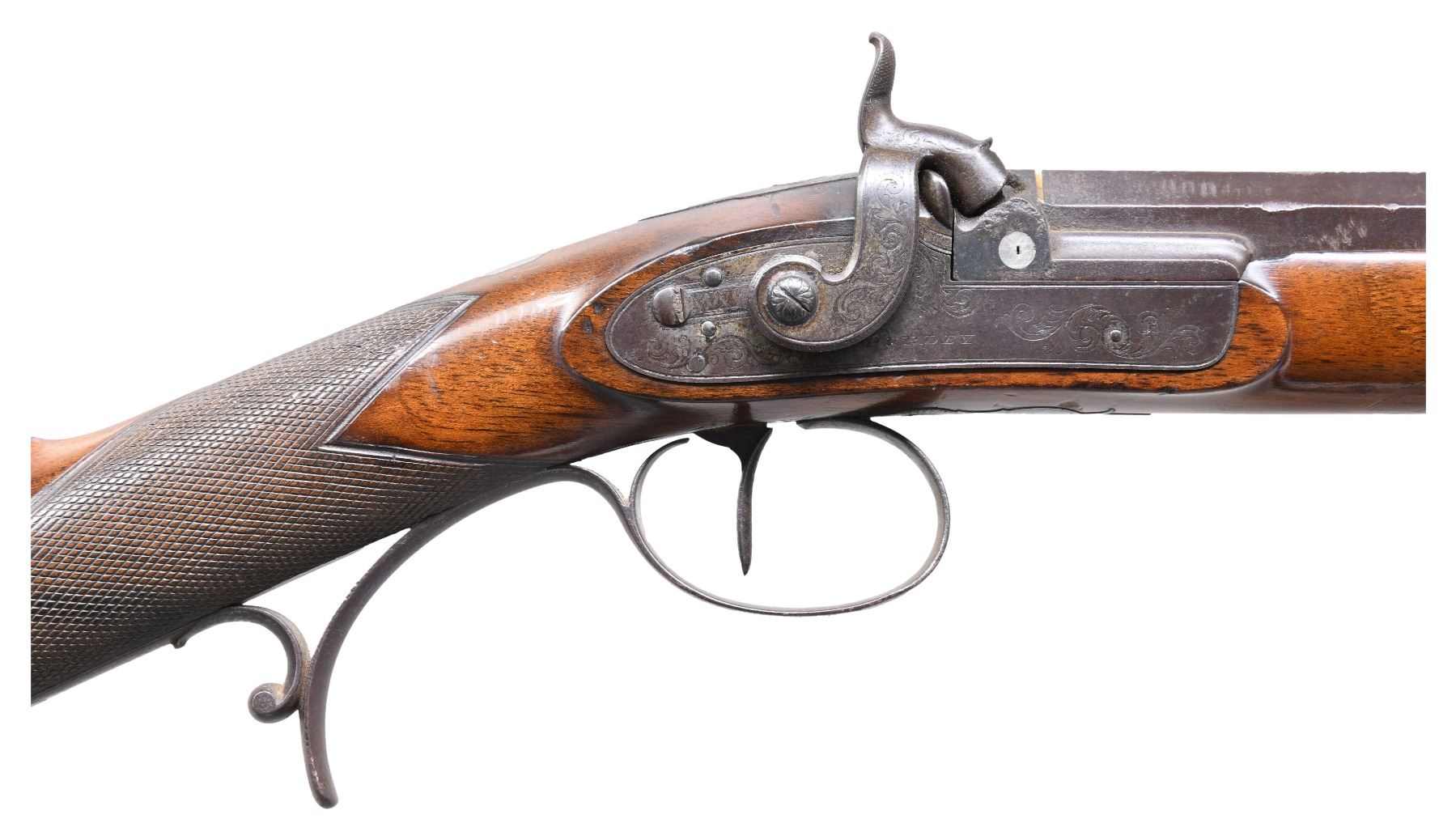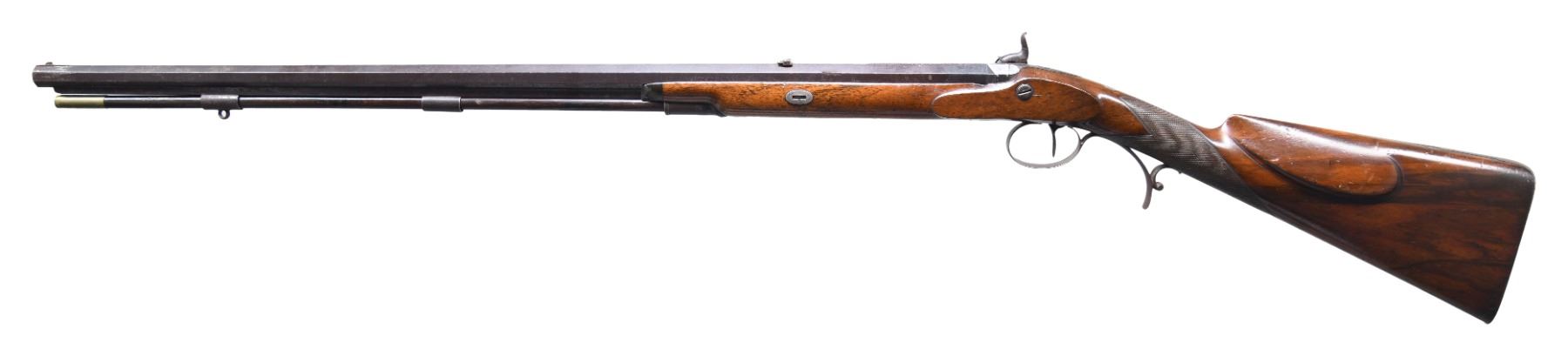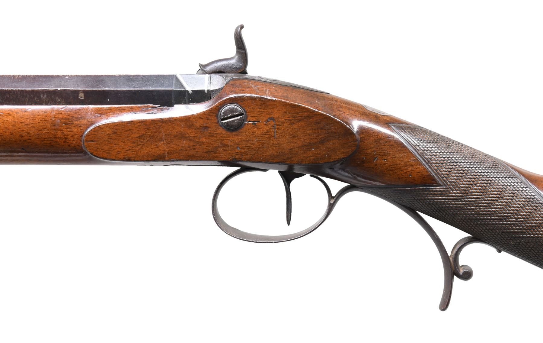 PERCUSSION RIFLE. Cal. 47 (.490 groove diameter/12 groove rifling). S# 1335 (1828). This neat little rifle of relatively large caliber weights 4 lb. 13 oz. and would be the perfect thing for most primitive weapon hunting. Unsworth in "THE EARLY PURDEYS" lists this as a single rifle sold on 23 September 1828 for 36 pounds 15 shillings, which was the standard rate at the time. It has 28" tapered octagon barrel with under rib. Top flat is engraved "J. PURDEY 314 1/2 Oxford Street London" behind one standing, two nested folding leaf rear sight with platinum lines. Front sight is a simple steel blade dovetailed through. Bottom of barrel is stamped with S#, London proofs and "JP". Patent breech with two inlaid platinum lines has vented platinum blow out. Breech iron with integral fence is engraved with shaded scroll. Front spring lock with flat faced hammer having stylized dolphin head is fitted with back sliding safety and engraved with about 50% coverage well cut open scroll in normal pattern for early Purdey guns and rifles. Trigger plate fitted with set trigger, has pineapple finial engraved with classic early shell motif. Trigger guard with scroll on bow has spurred tang forming grip. Stock of well streaked European walnut measures 14" over steel buttplate with long scroll engraved top tang. Stock features very small double shadow line swept right hand cheekpiece and flat top grip checkering. A vacant silver octagon is at top of grip. Forend tip is horn. Stock attaches to barrel with sidebolt through oval silver escutcheons. What looks to be original greenheart ramrod with brass head and tail (worm under cap) mounts through two plain pipes (front with sling eye) and beaded steel thimble. CONDITION: very good original "as found". Barrel retaining a fair amount of original brown under considerable overall rusting which presents a dark brown appearance. There are many vice or wrench marks at breech area from attempted breech plug removal. Other metal parts show traces of original blue under overall light rusting and cleaning does not appear to have been attempted. Buttplate is nearly all brown. Stock shows about 85-90% original finish with considerable crazing, marks and dents overall. Bore is good, fairly shiny with strong rifling throughout as well as considerable frosting throughout (should still shoot quite well). Lock is crisp, safety does not operate (probably gummed) and finger tab is broken. Set trigger works. A fine small rifle that should profit from some TLC. (01-26886/MGM). ANTIQUE. $2,500-3,500.