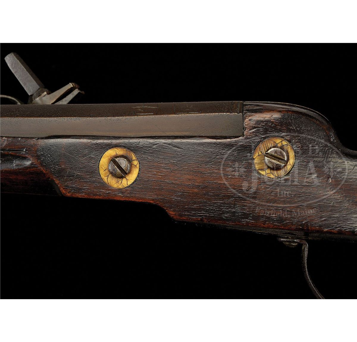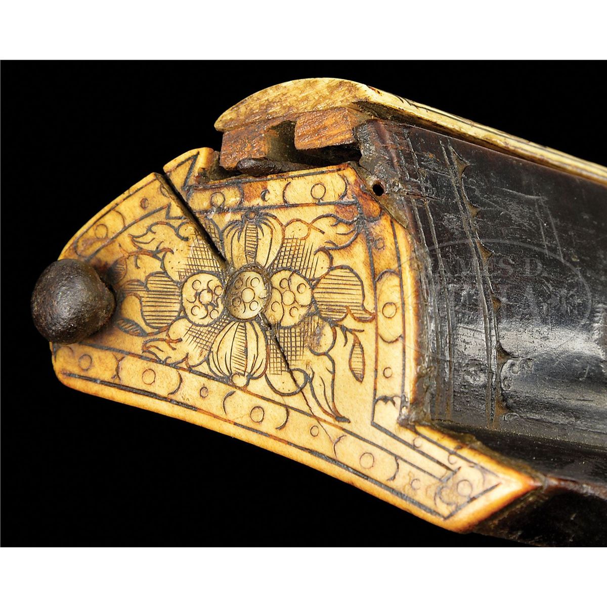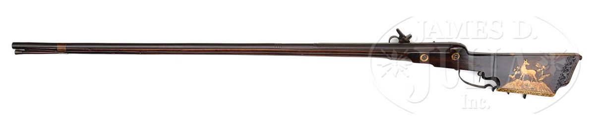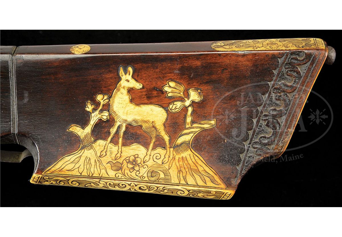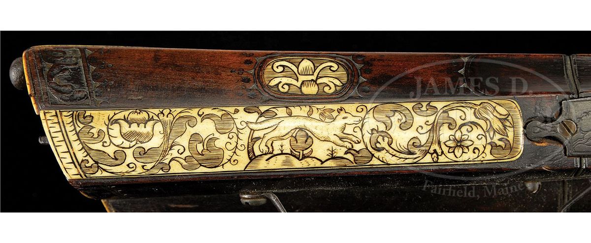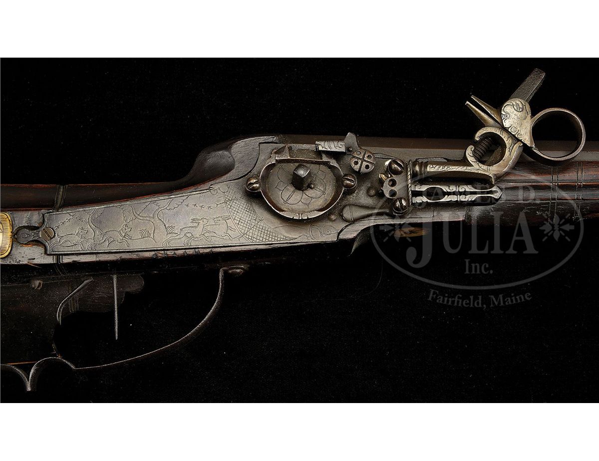 NSN. Diminutive lock, lightly engraved with dogs chasing a rabbit. Hammer engraved with florals. Dog spring well filed. Wheel plate with engraved flower. Pan cover release pierced with four holes. Oct to hexagonal to round bbl, with sighting rig engraved with the number "14" and the letter "F". Dark walnut full stock carved at butt and inlaid with engraved stag horn. Standing deer on cheek piece. Elaborate carving of fox amidst scrolls of hatch box, and expanded flower on stag horn butt plate. NOTES: Very attractive, lightweight wheel lock fowling piece. PROVENANCE: Collection of Dr. Douglas Sirkin. CONDITION: Metal largely untouched with deep brown patination and minor pitting. Extra screw through tail of lock plate. Small piece of stag horn missing from base of hatch box. Carving crisp. Brass bbl band added, likely during period of use. 4-49777 MZ37