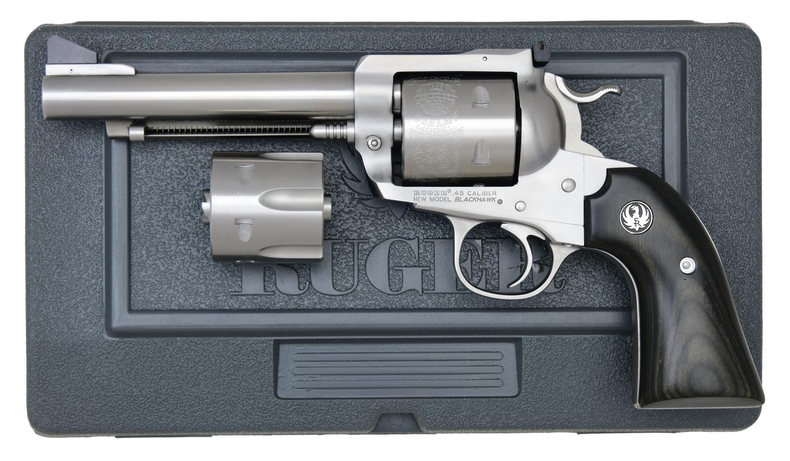 CONVERTIBLE REVOLVER. Cal. 45 Colt / 45 ACP. S# 48-39567. Bbl. 5 1/2" with ramped, pinned and blued serrated blade front sight plus corresponding factory frame mounted adjustable rear. Mfg. 2009 (1973 to date for all New Models) as Model 00472 with catalogue designation KRBN-455WX. Special convertible Bisley sold exclusively by RSR Distributors. All stainless with Bisley grip frame, hammer, trigger and unfluted 45 Colt cylinder having rolled Bisley markings. Smooth black laminated grips with silver eagle medallions. UNATTACHED ACCESSORIES: matching numbered gray plastic factory case with packaging to include matching numbered, fluted 45 ACP auxiliary cylinder. CONDITION: all aspects near excellent appearing new and unfired. PROVENANCE: from the William Blount Collection. (24-1814/NW). MODERN. $550-800.