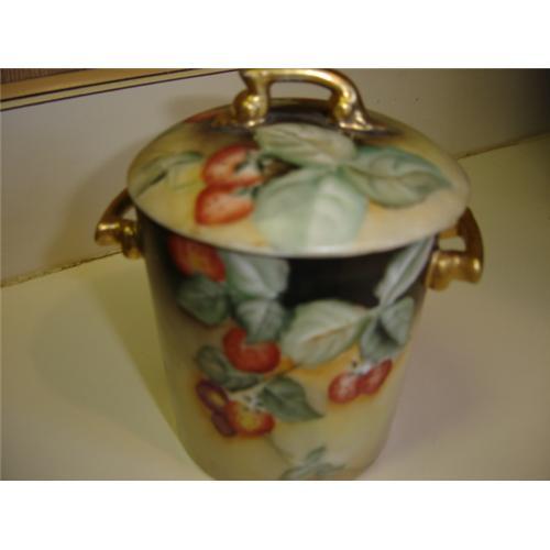 LIMOGES OF FRANCE T & V STAMP ON BOTTOM. STRAWBERRIES AND LEAVES WITH GOLD HANDLES AND SAME DESIGN ON LID. 4 INCHES HIGH AND 31/2 ACROSS.