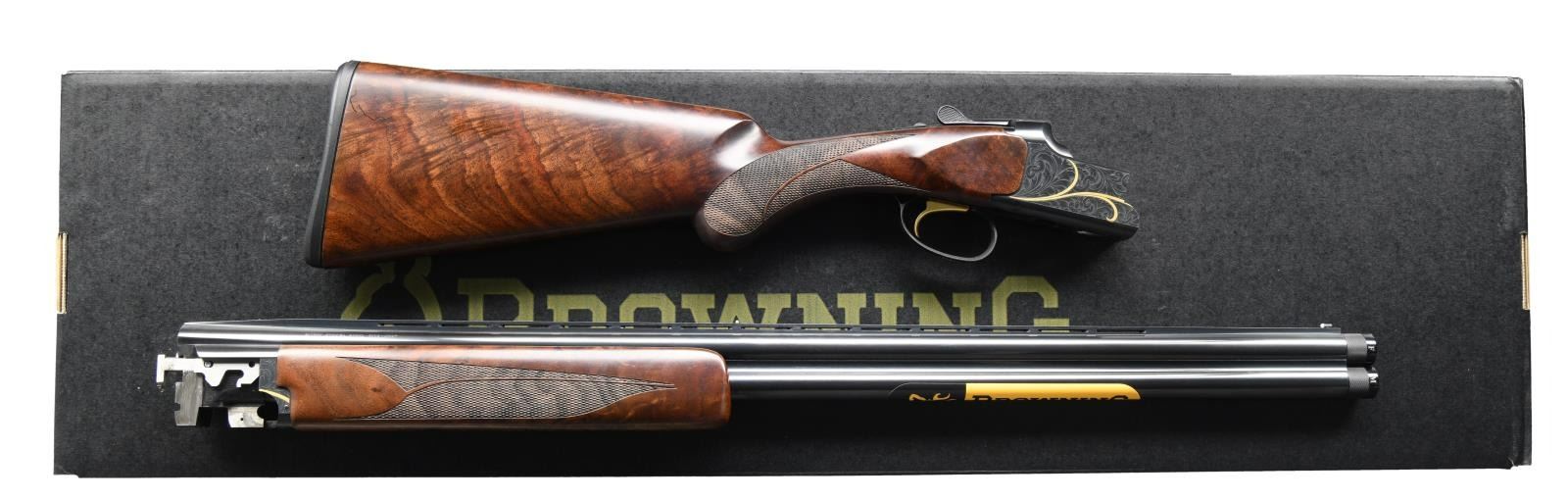 SHOTGUN WITH BOX. Cal. 16 Ga., 2 3/4". S# JP16695YY131. Blued 28" VR bbls. with Full/Mod "MIDAS" black screw in chokes. Blued boxlock action with intertwining scroll and gold accents at sides. Bottom of action marked "Gran Lightning". Checkered Lightning style stock and forearm of nicely figured American walnut with Inflex recoil pad. UNATTACHED ACCESSORIES: matching Browning black cardboard box with foam inserts, lock, chokes and paperwork. CONDITION: all aspects near excellent; appears new. PROVENANCE: The Collection of Gun Sport Ltd. owned by Jon R. Thomas. (23-3440/BH). MODERN. $3,000-3,700.