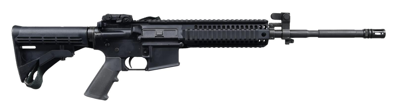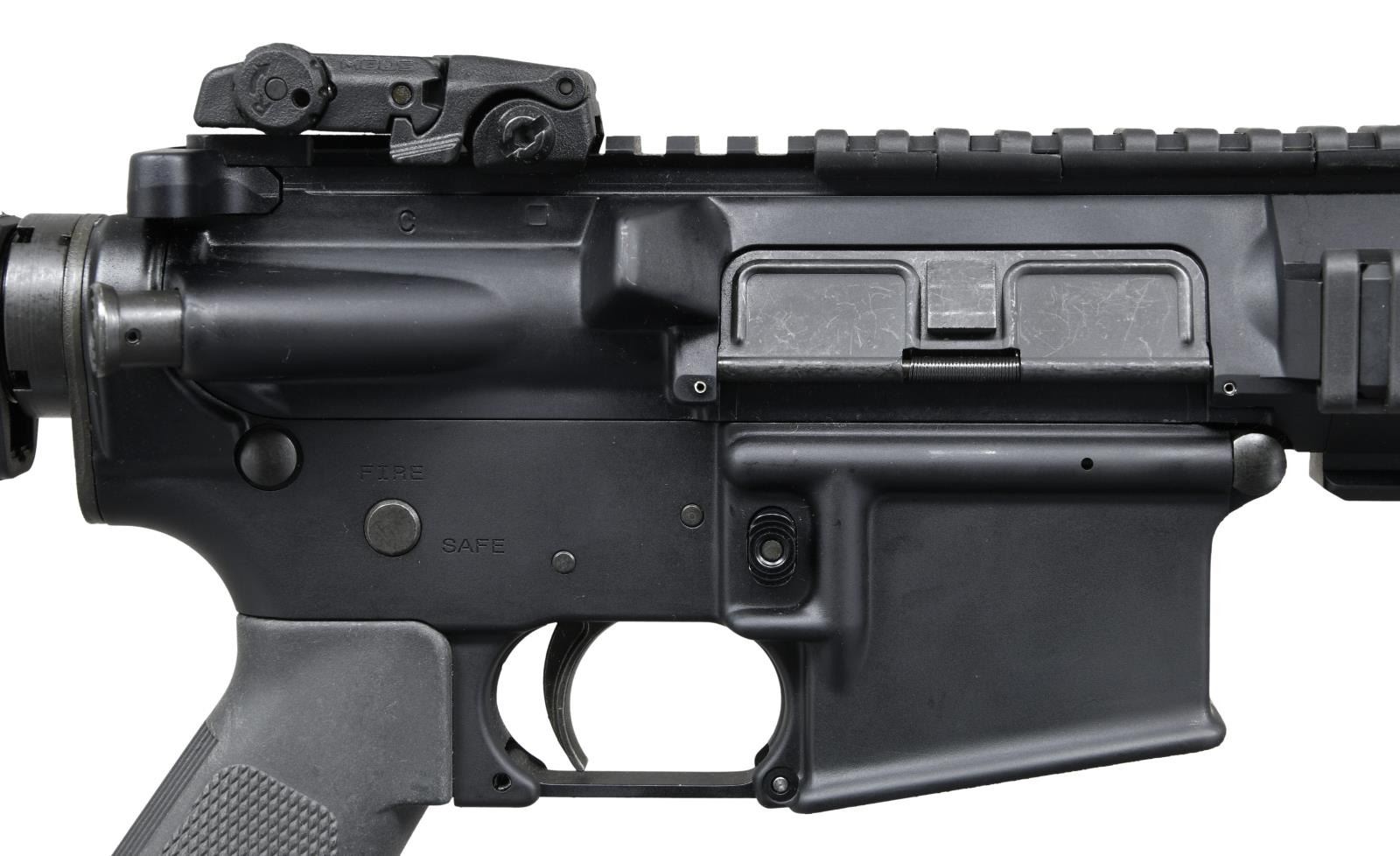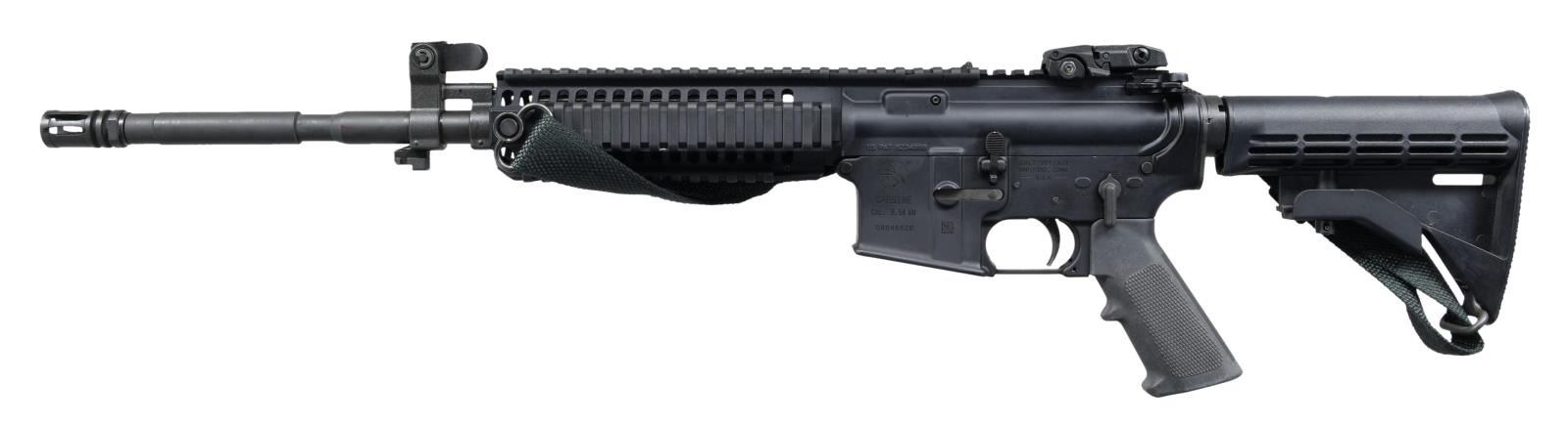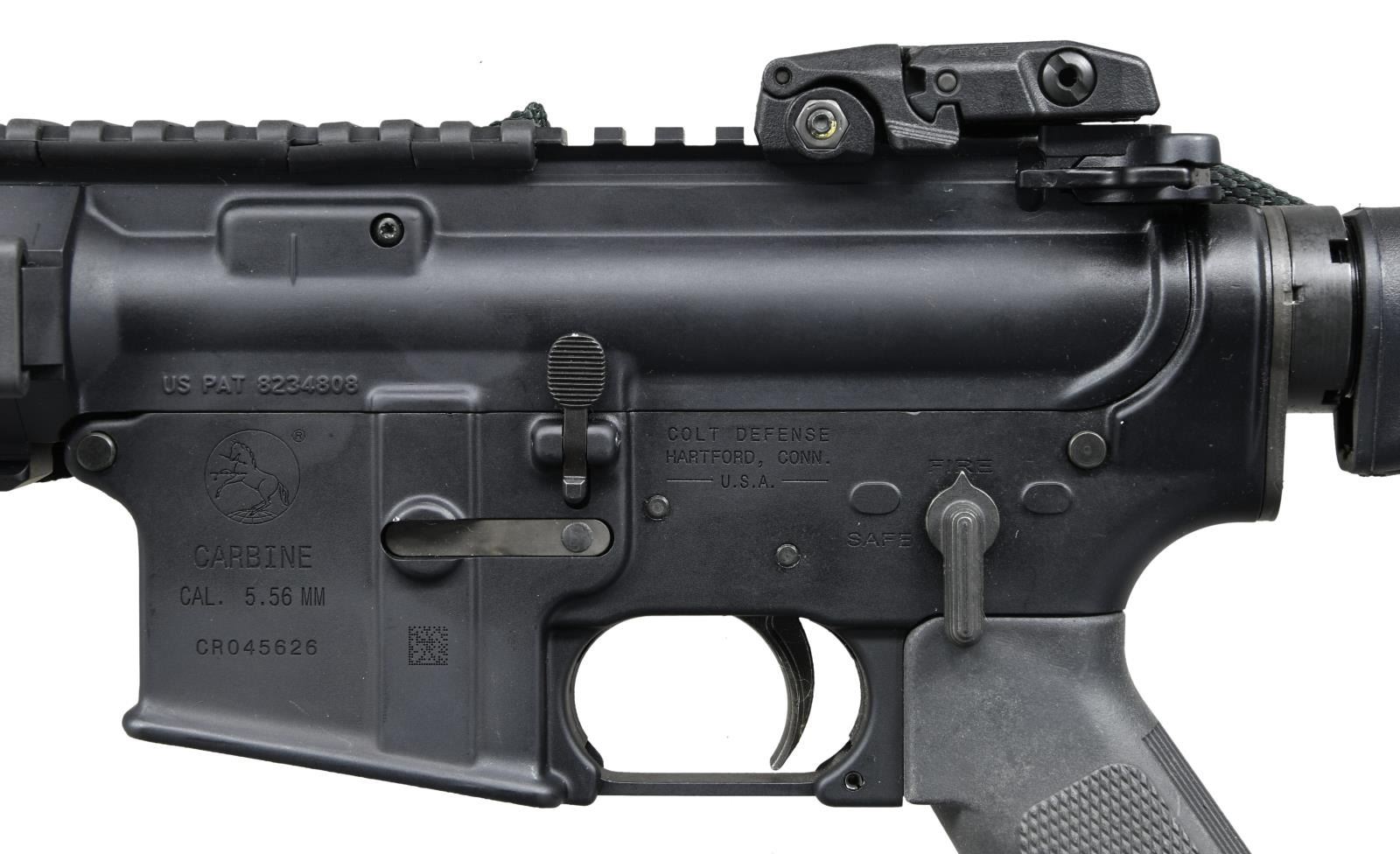 Cal. 5.56mm. S# CR045626. Bbl. 16". Colt Defense's latest offering to the wildly popular MSP market. 1/7 M4 profile barrel, w/ threaded muzzle, terminated w/ A2 flash hider. Monolithic rail upper receiver, providing 14" of picatinny rail on top, & 7" on sides & bottom. Brass deflector & round forward assist. Folding sights, front & rear. Bayonet lug. 4 position collapsible shoulder stock. Black nylon sling. CONDITION: All aspects indicate very little use. Brass deflector isn't marked, which happens almost immediately. Bright bore w/ strong rifling. Fire control mechanism appears to function correctly when cycled by hand. (23-1081/JZ). MODERN. $600-1,000.