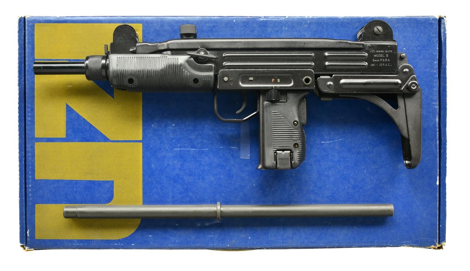 Cal. 9mm. S# SA48998. Bbl. 16". Mfg. Action Arms Ltd. / IMI. UZI model B semi automatic carbine. A closed bolt semi automatic version of the world-famous SMG. Fitted w/ factory collapsible stock & including a 3.5" bbl. blank, almost resembling the SMG to a "T". Front sight elevation adj. protected post. Windage adj. rear sight, flip up L type peep sight marked "1" & "2". Classic black painted finish on exposed metal parts. F-S trigger group. Rotating sling swivel on left side of receiver. Black plastic furniture. MAGS: 1-25 rd. IMI. UNATTACHED ACCESSORIES: 3.5" factory bbl. display blank, styrofoam lined blue factory box. Tan canvas sling. CONDITION: All aspects appear this firearm is as new. No noticeable blemishes on finish of any exposed area. aside from very little thinning in areas of mechanical intervention, such as where the stock closes on itself which happens almost immediately. Bore is shiny w/ strong rifling. Fire control mechanism appears to function properly when cycled by hand. (22-5202/JZ). MODERN. $1,200-1,800.
