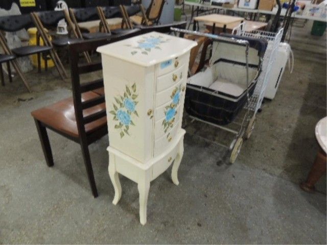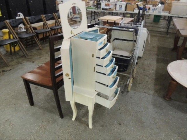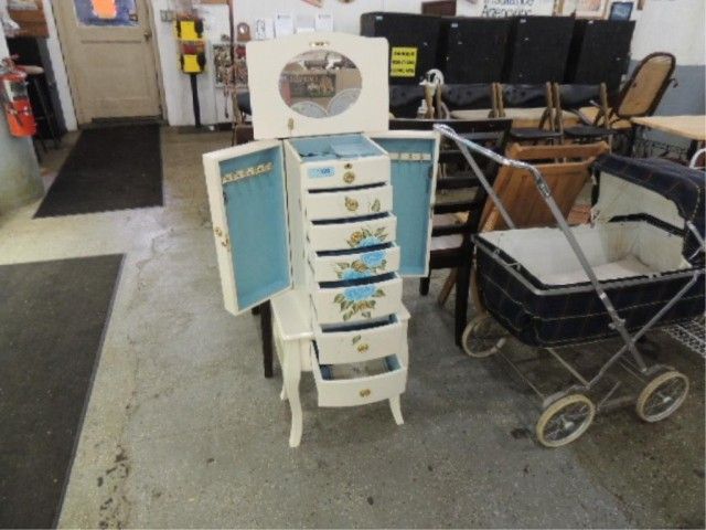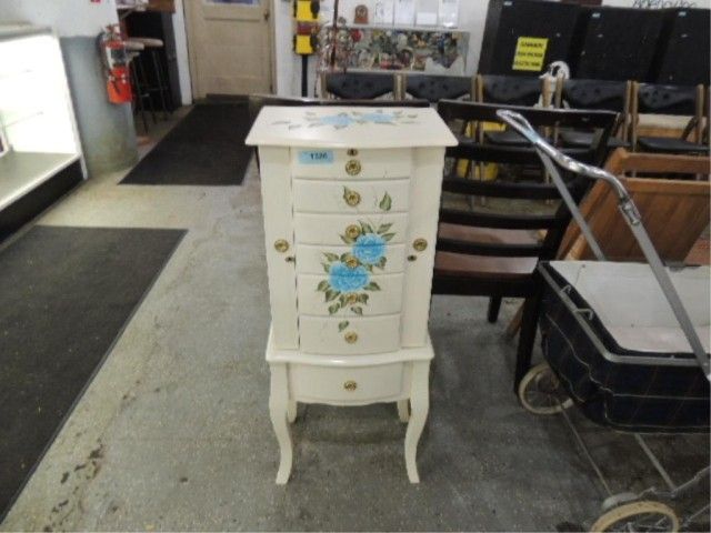 FREE STANDING CONTEMPORARY STENCILED JEWELRY CHEST CABINET. SIX DRAWERS. TOP OPENS FOR RING HOLDERS AND DIVIDED STORAGE. SIDES OPEN FOR NECKLACE HANGING. STANDS 40" TALL. KEYS, MANUALS, PAPERWORK, ETC. AS SHOWN.