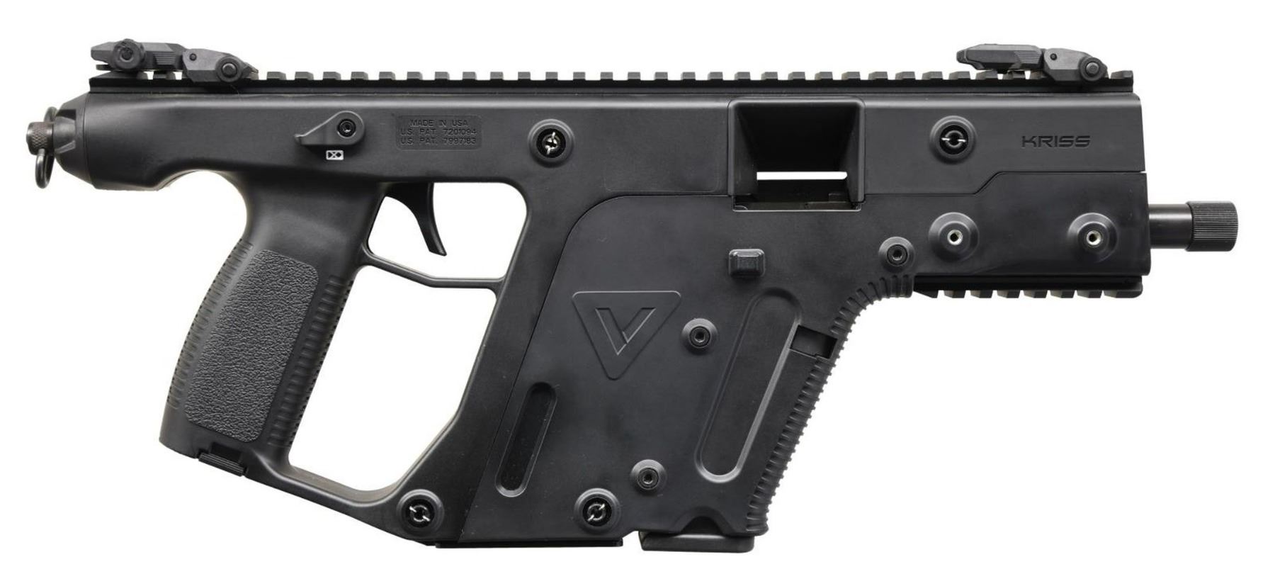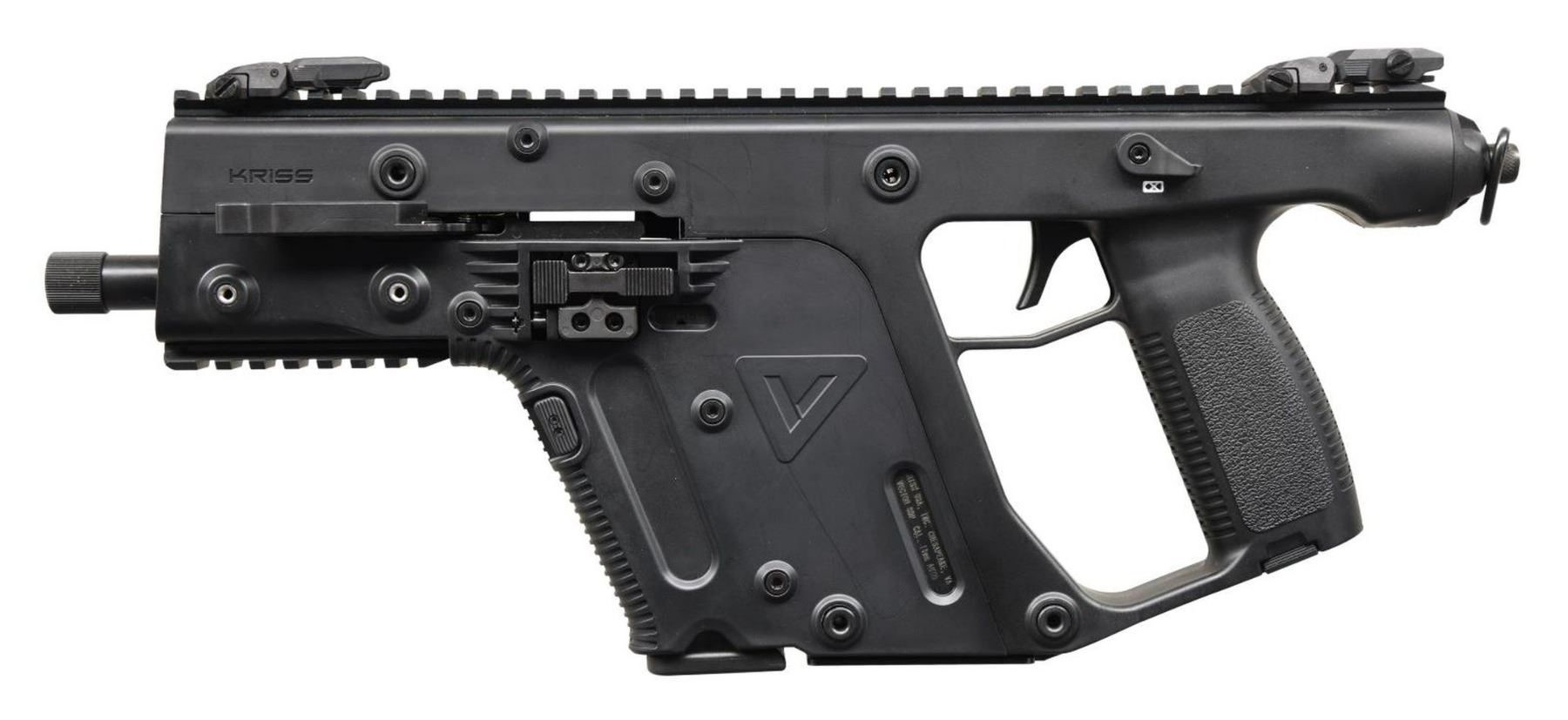 Cal. 10mm. S# 10P005202. Bbl.5.5". The smallest & lightest offering in the Kriss Vector family. They are available in Carbine, SMG & Pistol configurations, this example being the latter. 4140 Chrome Moly barrel w/ black Nitride finish. Closed bolt, delayed blowback operation w/ Super V Recoil Mitigation System. 15" Picatinny rail on top, currently hosting low profile flip-up sights. Ambidextrous safety / selector. Left side magazine & bolt release. Utilizes standard Glock magazines. QD sling swivel at rear. MAGS: 1 Glock 15 rd. UNATTACHED ACCESSORIES: w/box. CONDITION: all aspects indicate very little use, if any. No visible blemishing of any kind. Bright bore w/ strong rifling. Fire control mechanism appears to function correctly when cycled by hand. PROVENANCE: The Collection of Gun Sport Ltd owned by Jon R. Thomas (23-4383/JZ). MODERN. $700-1,100.