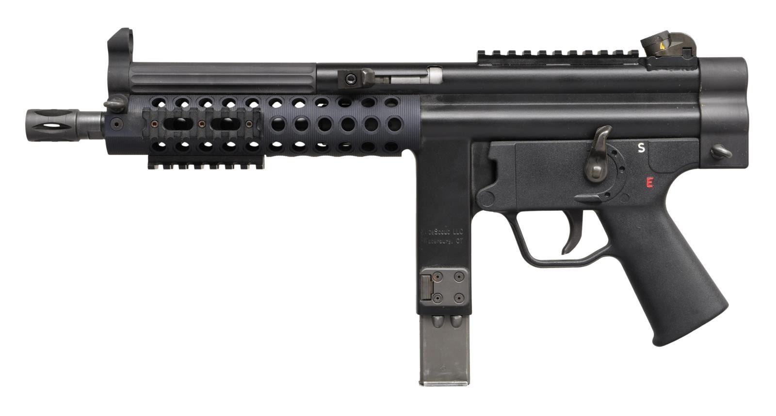 Cal. 9mm. S# A00309. Bbl. 8.5". The LUSA was originally designed in Portugal by INDEP in 1993. The name "LUSA" derives from Lusitania, which was the Roman name for the Iberian region that covers present day central and southern Portugal and part of Spain. Aesthetically it has recognizable features primarily from the MP5 family, even utilizing the same trigger pack. Originally designed with military & law enforcement in mind, the project was discontinued in 1992. In 1994 INDEP sold the dies, tooling, fixtures and manufacturing rights to Stan Andrewski, owner of Stan's Gunsmithing in Webster New Hampshire and the LUSA USA went into production as a closed bolt, recoil operated system. The NiteScout is yet another generation of this design, utilizing a few more of the prior HK features, such as the 4 position drum rear sight, and the plastic "S-F" trigger group. The NiteScout also utilizes the popular & readily available Uzi magazine, rather than a proprietary example like the original LUSA. This particular example is in a pistol configuration. 8.5" threaded barrel terminated w/ flash hider. Matte black finish on all exposed metal surfaces. Buttcap at the extreme rear, secured by a single threaded pin on the right side, doubling as a rear sling attachment point on the left. Protected post, AR15 style front sight, adjustable for elevation. 4 position drum rear sight, adjustable for windage. 4.25" picatinny rail section for optic mounting on top of receiver. Left side, non reciprocating charging handle w/ rear lock position, similar to the MP5. Left side controls on plastic "S-E" trigger group & mag release, located at the bottom of the mag well. 8" aluminum handguard w/ 3" picatinny rail sections at 3, 6 & 9 O'clock position. Overall weight w/ empty 25 rd. mag, 7 pounds, 15 ounces. Overall length 18.5". MAGS: 2 steel 30 rd. UNATTACHED ACCESSORIES: black nylon LUSA branded Uncle Mikes zippered case w/ 6 magazine pockets. CONDITION: all aspects indicate very little use, if any. Finish enjoys complete & consistent coverage w/ no visible blemishing or signs of wear. Bright shiny bore. Fire control mechanism appears to function correctly when cycled by hand. (23-2322/JZ). MODERN. $600-800.