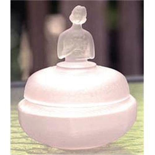 <table width="100%" border="0" cellspacing="0" cellpadding="4"><tr><td><em> </em></td></tr><tr> <td width="100%"> Known as Lillian ll this powder jar is shown and described on pages 28-29 of Whitmyer: Bedroom & Bathroom Glassware Of The Depression Years . The finial features a woman, from the waist up, holding a fan. Produced in what appears to be crystal satin glass but also has a pink tint. The base is hexagonal with a stipple pattern. The lid has the same pattern. Measuring 5" tall x 4 ½? across the rim and in excellent </td></tr><tr> <td> </td></tr><tr> <td>Reference #: aaLCPSGPJ</td></tr><tr><td>Condition:Excellent</td></tr><tr><td>Year:1930s</td></tr><tr><td>Title:LILLIAN ll Satin Glass Powder Jar</td></tr><tr><td>Location:Orlando, Florida</td></tr></table>