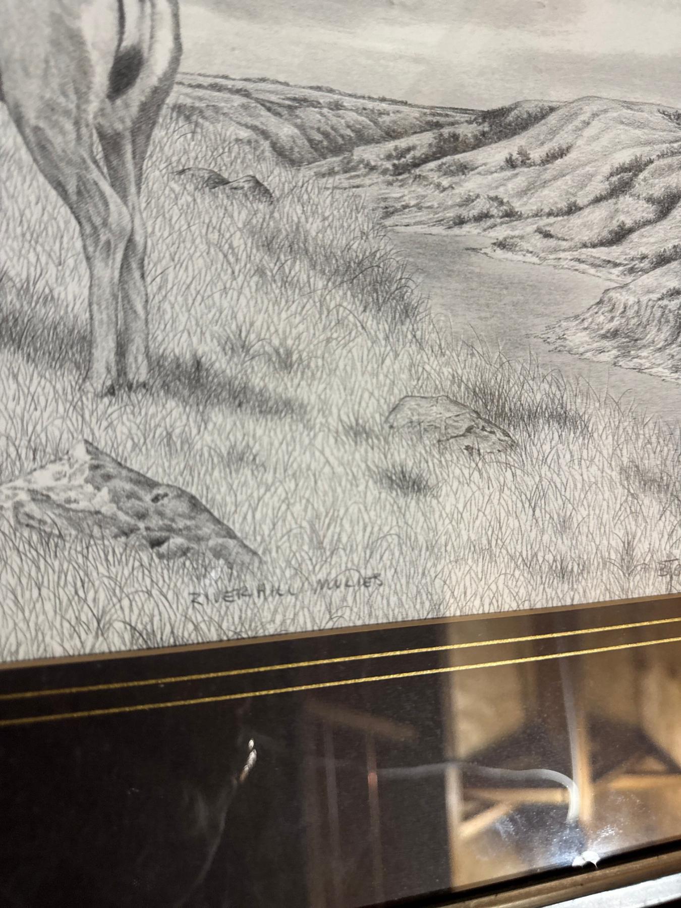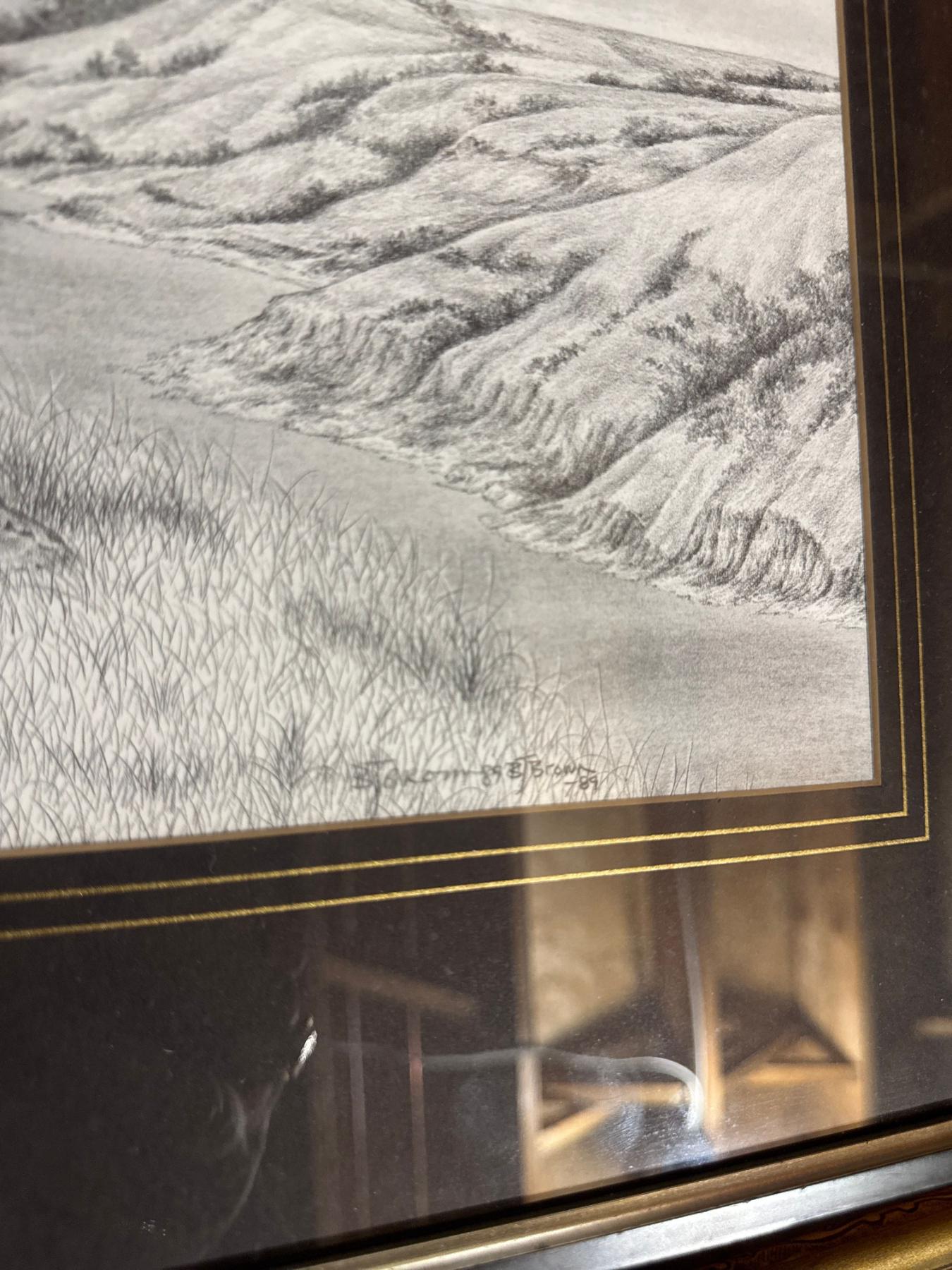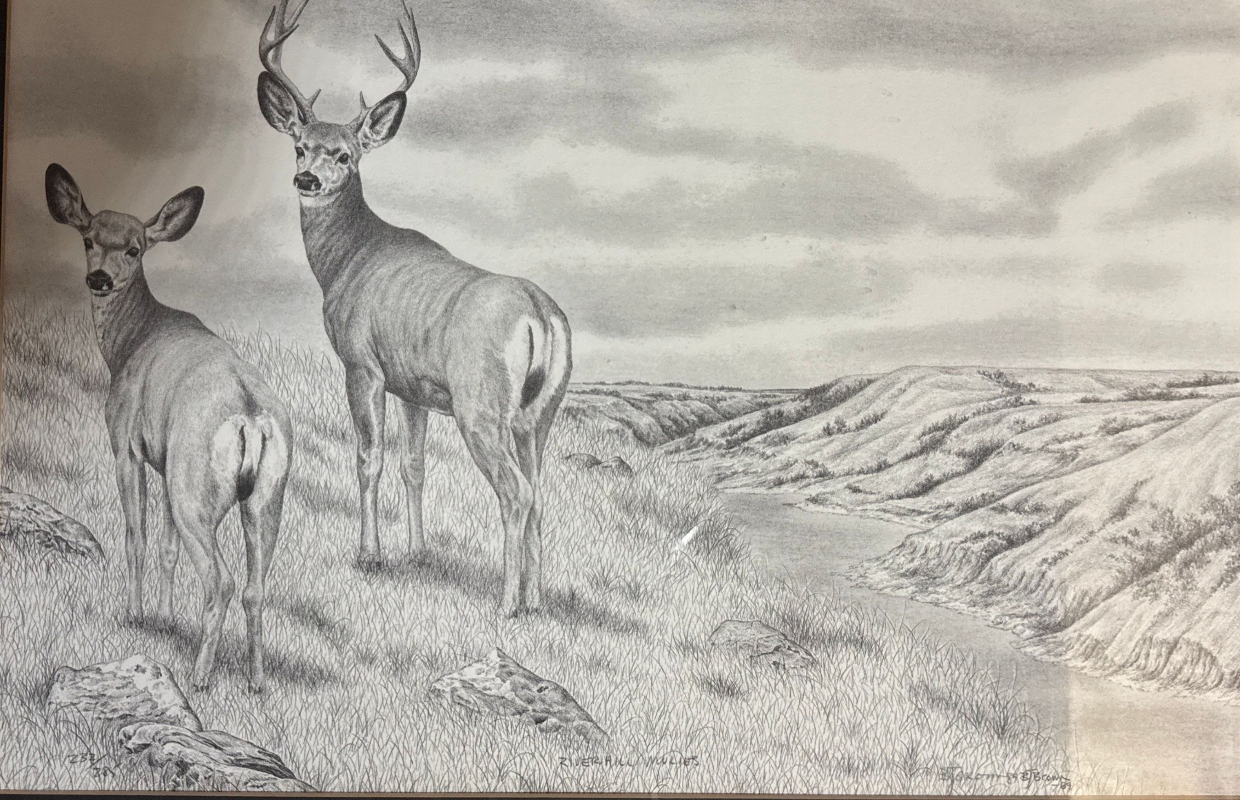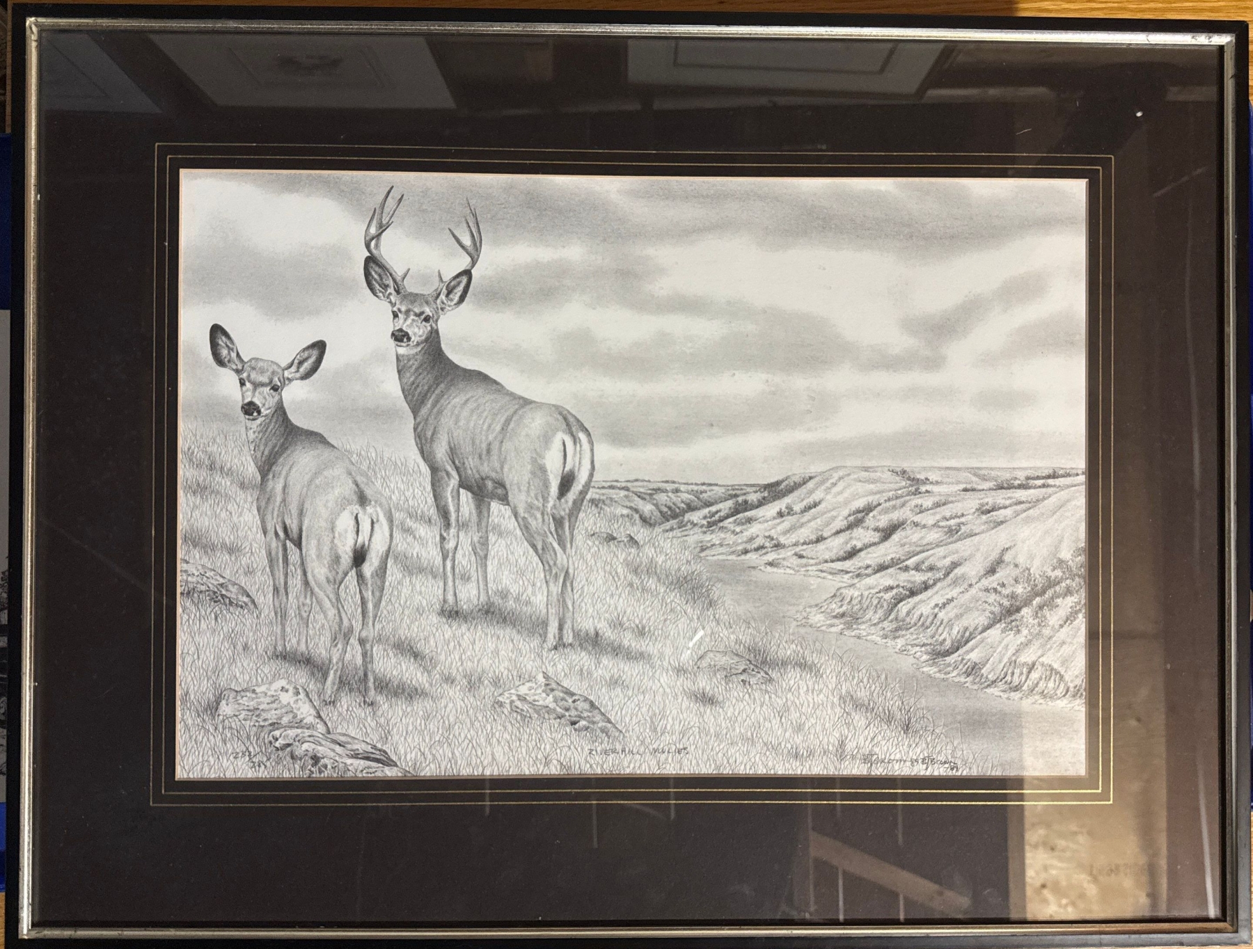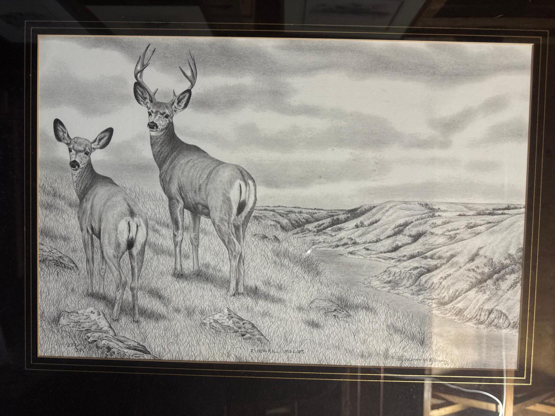 LIMITED EDITION 232/285 RIVER HILL MULIES framed graphite pencil drawing depicting a mule deer buck and doe in a natural landscape setting. SIGNED "B. Brown" followed by the year "'89".