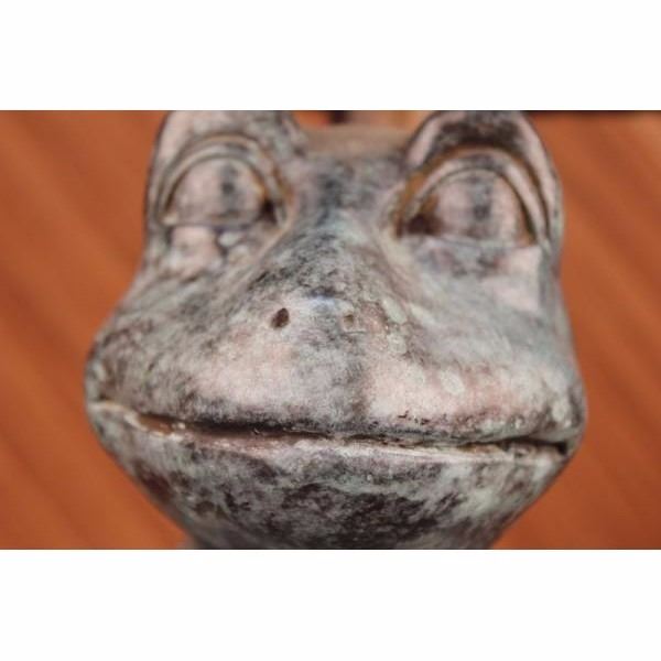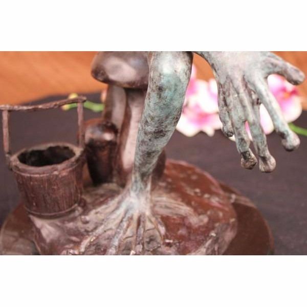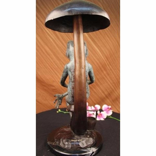 This is an adorable limited edition collector’s item of 100. It is a statue of a frog fishing and sitting underneath a large mushroom. He sits smiling, enjoying his favorite hobby and casually resting one leg over his knee. He rests upon a toadstool, a small one sprouted next to his and an even larger one providing him shelter and a back support. A bucket is at his feet, empty and ready to keep some fish in, a make shift fishing rod rests in his hands. He has a beautiful patina that resembles an antique bronze as it is a teal patchy coat that covers the entire frog. The rest of this sculpture is a two tone brown patina, lighter at the top on the largest mushroom. Cast using the ancient “Lost Wax Method†and made of 100% bronze. Signed Marius. Condition: This sculpture is in perfect condition. Bronze Dimensions with Marble Base:Height 23" x Width 20" Marble Dimensions:Diameter 10" Height without base: 22 " Weight :27 LBS Inventory : 18-50596M11681