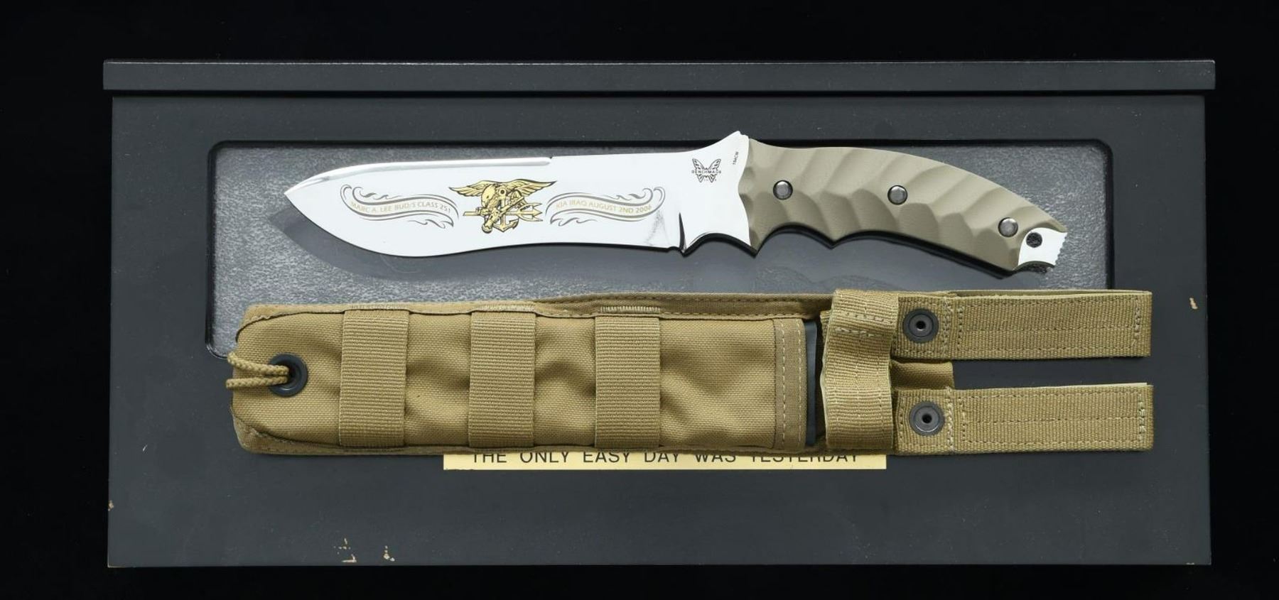 KNIFE WITH CASE. Marc A Lee (1978-2006) Navy Seal Bud/S 251 Petty Officer Second Class assigned to Seal Team 3. Killed while on patrol in Iraq August 2, 2006, the first Navy Seal to be killed in Iraq. He was the recipient of the Combat Action Ribbon, Meritorious Unit Commendation, & National Defense Service Medal. The knife is #85 of 251. the 154CM stainless steel blade is 7.3" long w/ commemorative Navy Seal motifs & marked "MARC A. LEE BUD/S CLASS 251" & "KIA IRAQ AUGUST 2ND 2006". Full tang w/ butt ferrule & notches on spine. Coyote Brown scales. Also included is 17.5" x 8.5" x 2" glass topped wooden display case w/ plaque on top "THE ONLY EASY DAY WAS YESTERDAY". Case contains paperwork, key & composite scabbard & OD brown nylon scabbard carrier. CONDITION: knife in near excellent condition. Case in very good condition w/ a few light marks. (02-21044/MD). $500-800.