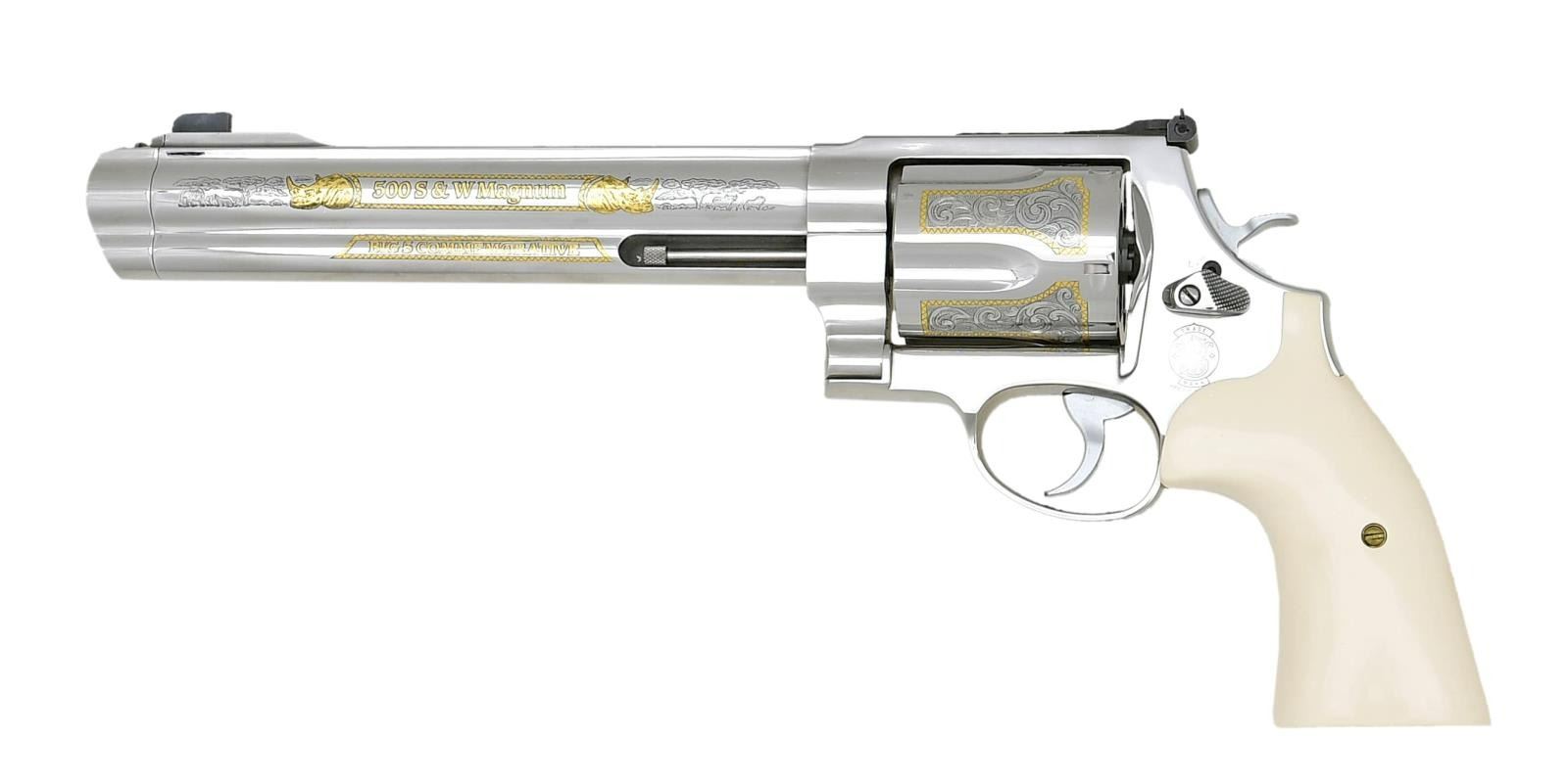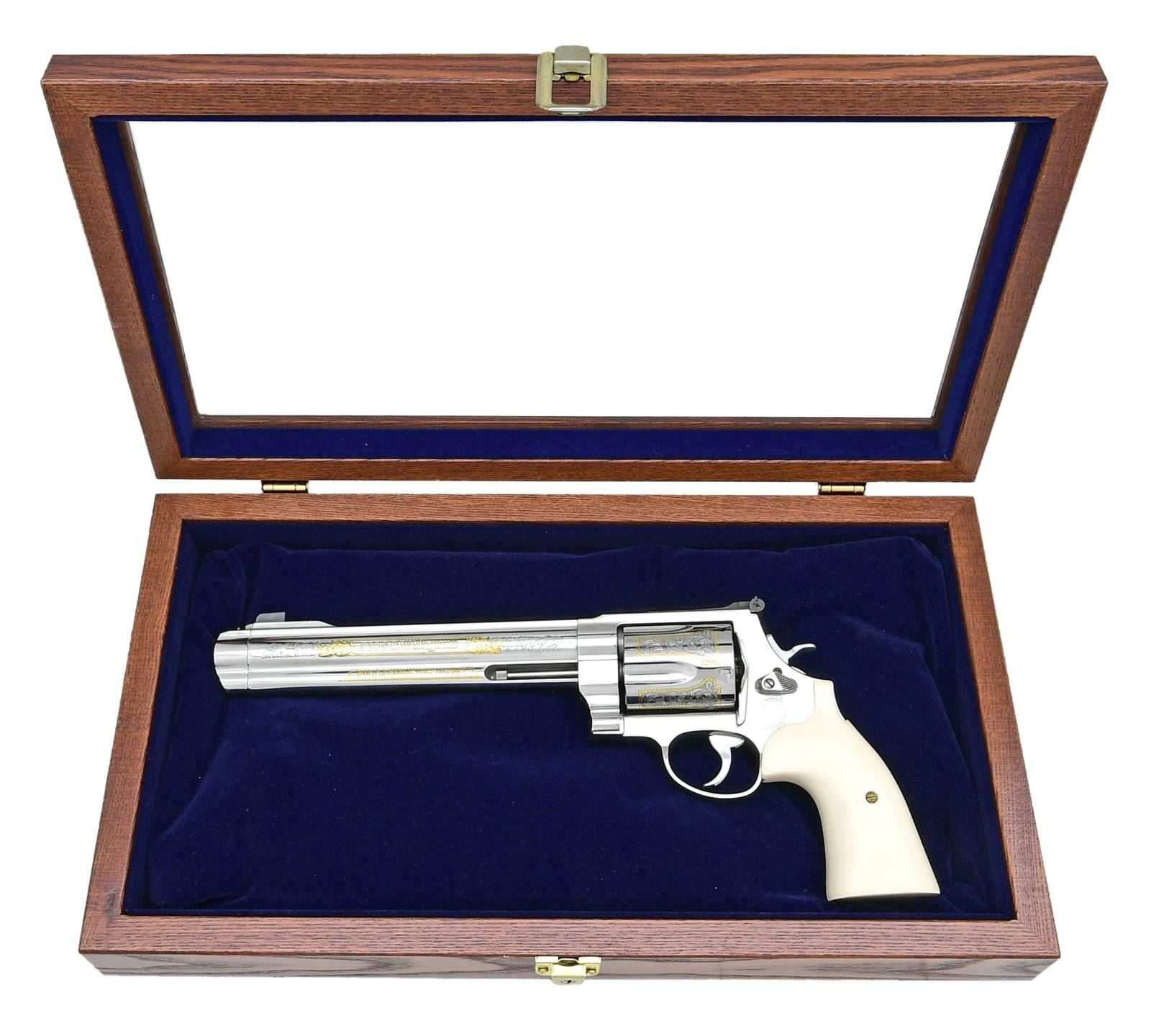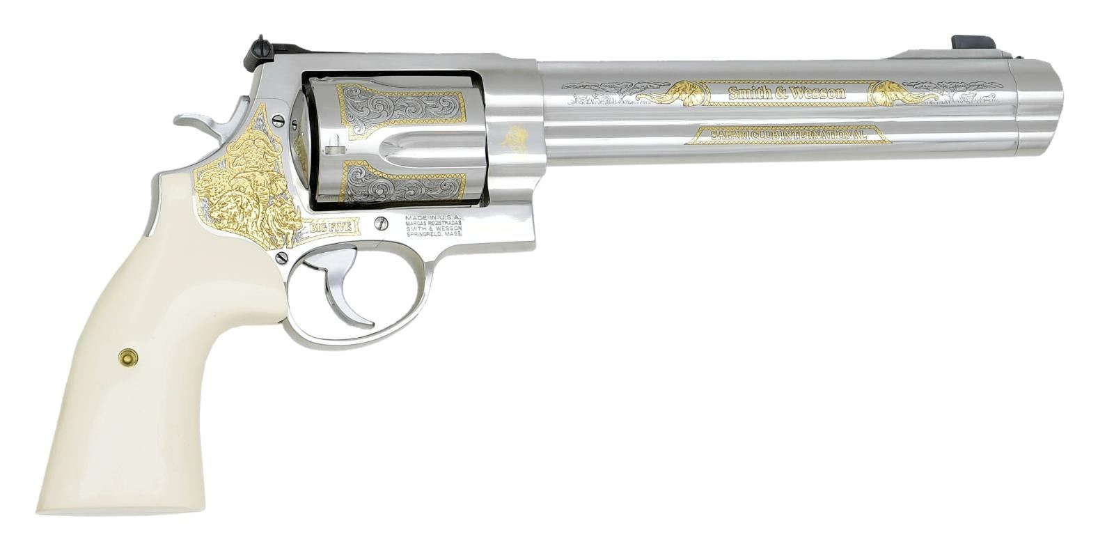 SAFARI CLUB INTERNATIONAL 1 of 300. Cal. 500 S&W Mag. S# SCI0050. Bbl. 8 3/8"". Mfg. 2004. The first 500 S&W Magnum revolver was introduced at SHOT Show 2003 & was an instant hit. Built on the X-Frame The Safari Club International Big 5 Commemorative features roll engraving w/ 24 Kt. Gold inlays of the African Big 5 animals; Leopard, Lion,Cape Buffalo, Rhino, and Elephant. Hi luster finish 8 3/8" serrated top barrel w/ muzzle brake. Black blade front & white outline micrometer click adjustable rear sights. 5 shot fluted cylinder. .430" checkered hammer & .400" smooth trigger. Full length barrel lug. Barrel marked on left side; "500 S&W MAGNUM / BIG 5 COMMEMORATIVE" & Rhino's w/ gold inlay. Barrel marked on right side; "SMITH & WESSON / SAFARI CLUB INTERNATIONAL" & Elephants w/ gold inlay. Right sideplate engraved w/ all of the Big 5 animals in gold inlay and "BIG FIVE". Receiver marked w/ SCI logo & "ONE OF 300". Smooth front strap & backstrap. High quality, smooth white plastic grips. UNATTACHED ACCESSORIES: hardwood & glass display case lined w/ blue velvet material, Factory letter validating 1 of 300 custom engraved by S&W. CONDITION: all aspects indicate as new, which is typical for a limited edition gun such as this. Finish unblemished, bore is bright w/ strong rifling. Display case illustrates no obvious blemishing. (23-1402/JZ). MODERN. $4,750-$6,500.