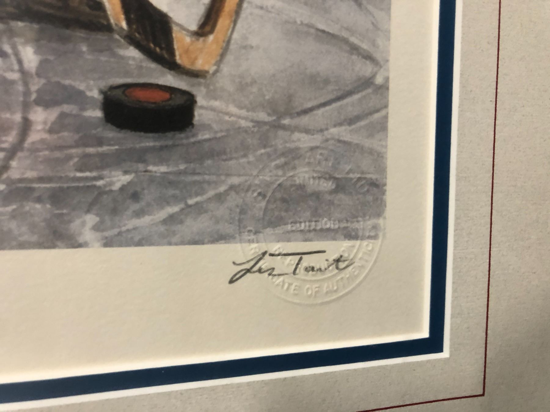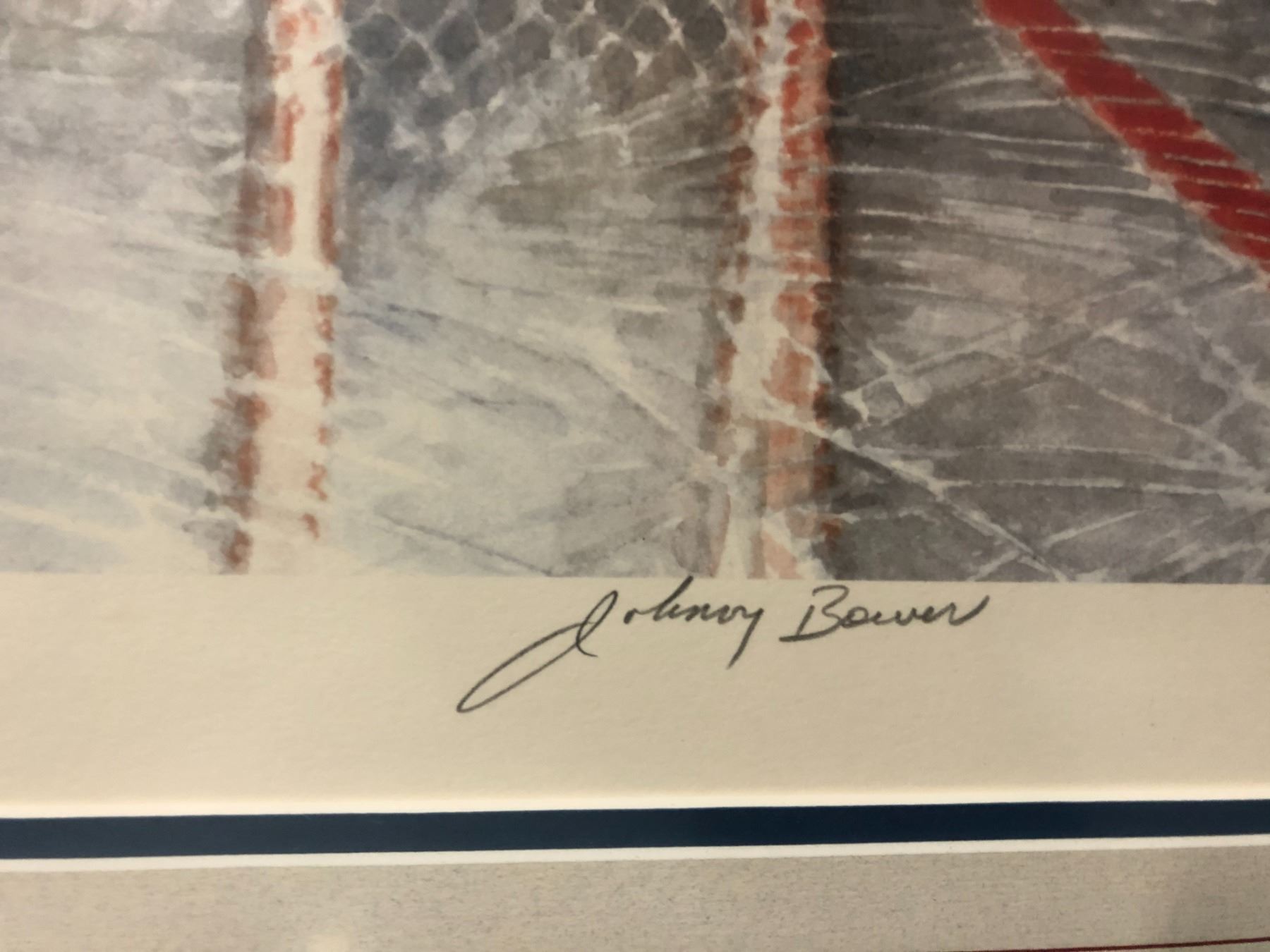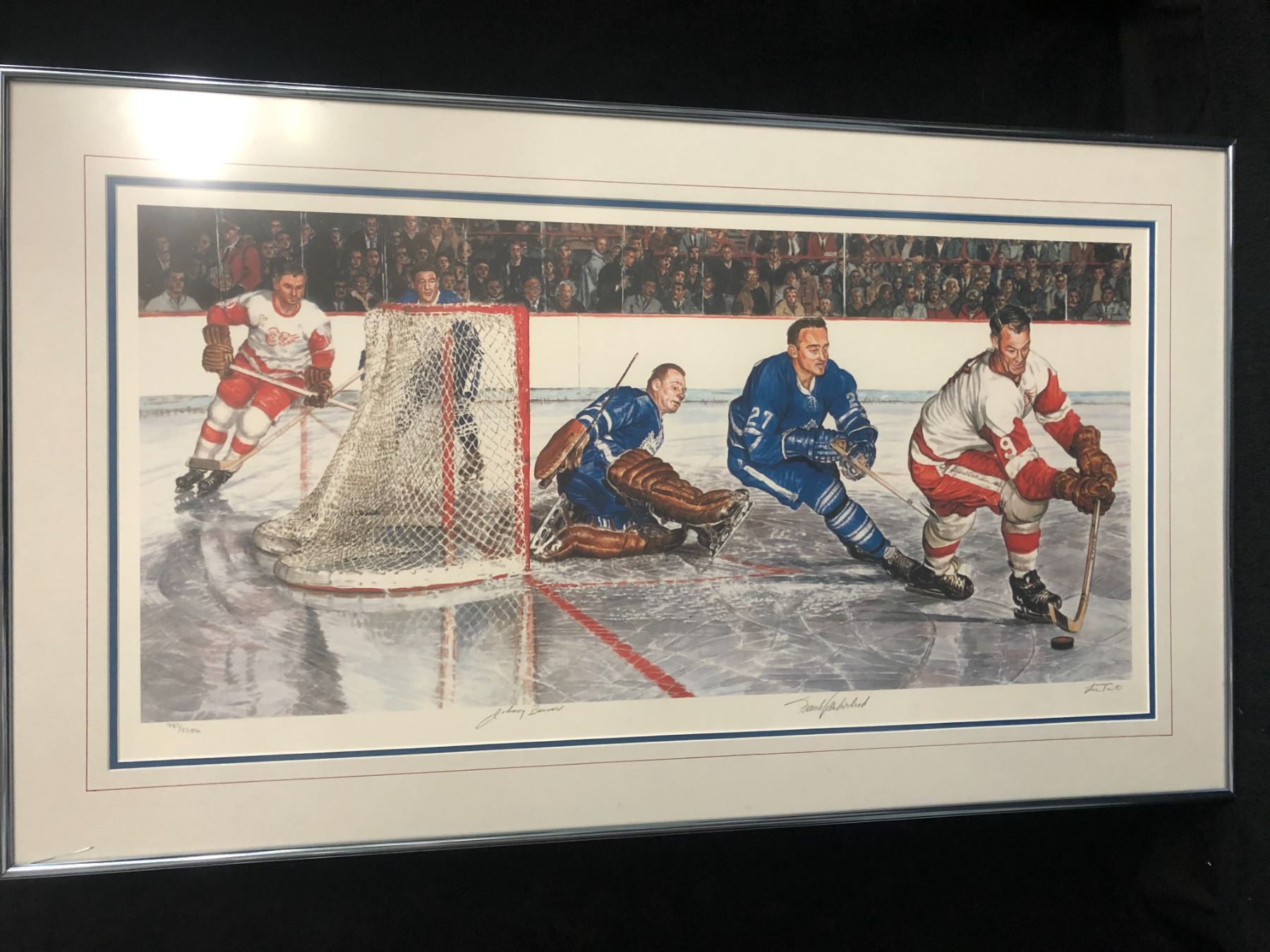 LIMITED EDITION JOHNNY BOWER & FRANK MAHOVLICH DUAL SIGNED 36X24 FRAMED HOCKEY PRINT (CERTIFIED)987/2250