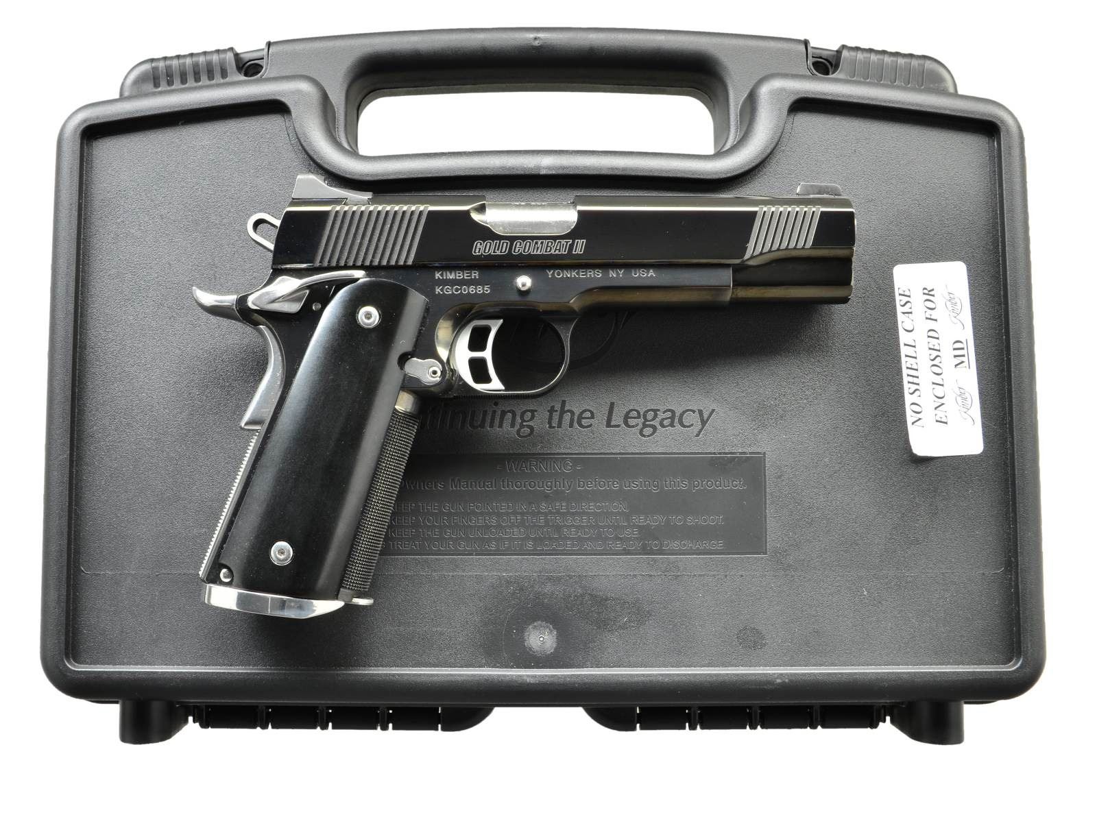 Cal. 45acp. S#KGC0685 Bbl. 5" match grade bull barrel w/ full length guide rod. Stainless steel slide w/ front & rear serrations finished in dark gunmetal PVD coating. 3-dot tritium night sights with fixed cocking shoulder. Stainless steel frame finished in dark gunmetal PVD coating. Bevelled, extended mag-well. Aluminum, match grade trigger. Smooth buffed black Micarta grips. Extended ambidextrous highly polished thumb safety. Extended highly polished grip safety. Checkered mainspring housing, front strap and bottom of trigger guard. Highly polished magazine release, slide release & mag-well extension. MAGS: Factory 8rd. UNATTACHED ACCESSORIES: Black plastic numbered factory case & paperwork. CONDITION: All aspects indicate as new. Still retains orange chamber flag. (22-2938/JZ). MODERN. $800-1,200.