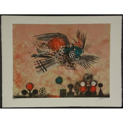 LIMITED EDITION LITHOGRAPH 16'' x 21'', Jacquot Pierre (1929-), France. A Surrealistic Bird Mobile. Signed lower right. Numbered 15/150 lower left. Unframed. More info. in the white binder.