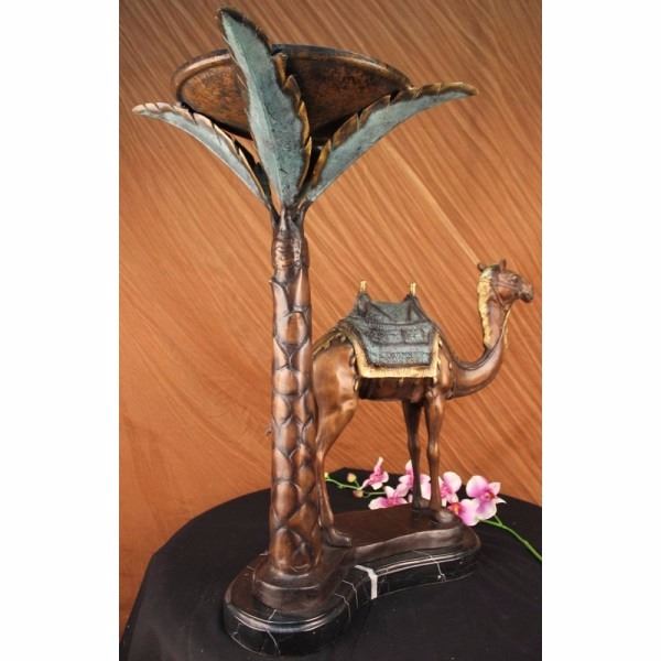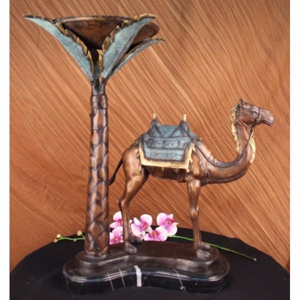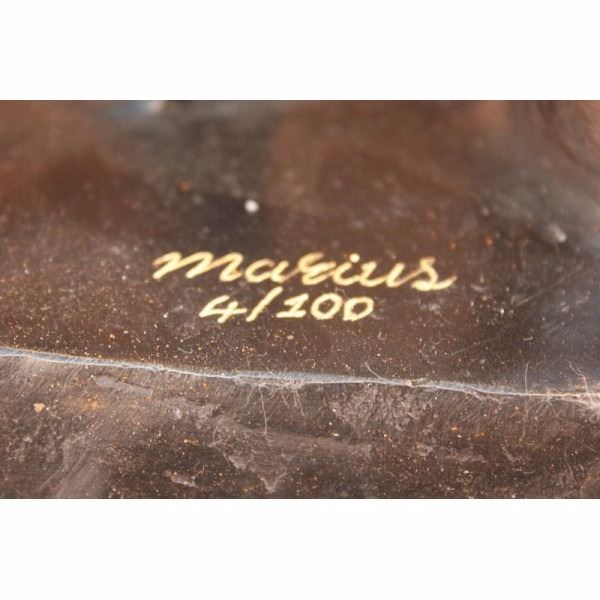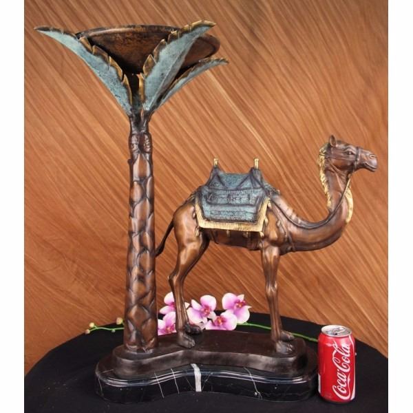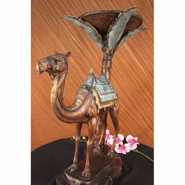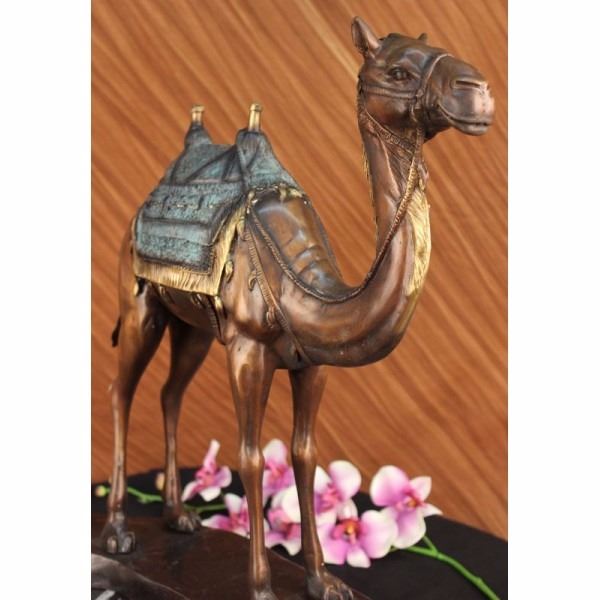 Limited edition sculpture, only 300 in this collection. This Statue is of a Camel who stands square, resting for a moment under the shade of a nearby palm tree. He has a saddle on his back that is empty of a traveler, and he waits patiently for their return. The saddle is decorated in three shades and has two peg handles to hold onto on top, the reigns wrapped around the front one hangs loosely. The face and entire piece has immaculate detailing, from the nostrils to the dangling tassels on the saddle. The palm tree is texturized on the trunk and reaches up to open leaves that are a silver color and match the fabric on the saddle. His feet rest upon a smooth surface of bronze and marble. This bronze sculpture was casted using the "Lost Wax Method" and has a brown, green and goldPatina. It is signed by the artist Marius and dated 2008.Condition: This sculpture is in a very Good condition. Bronze Dimensions with Marble Base:Height 26 1/2" x Width 27"Marble Dimensions:Diameter 17"Height without base: 25 1/2" Weight :36 LBSInventory :2316094240M32 Limited edition sculpture, only 300 in this collection. This Statue is of a Camel who stands square, resting for a moment under the shade of a nearby palm tree. He has a saddle on his back that is empty of a traveler, and he waits patiently for their return. The saddle is decorated in three shades and has two peg handles to hold onto on top,