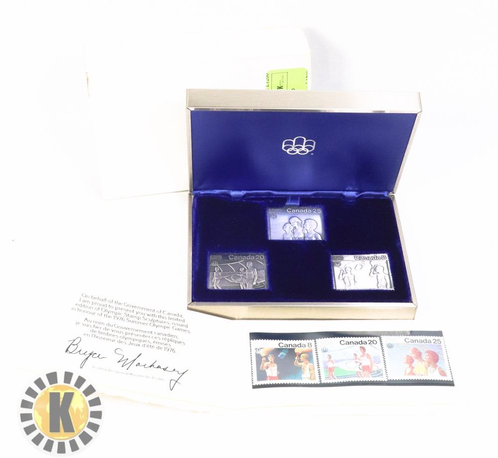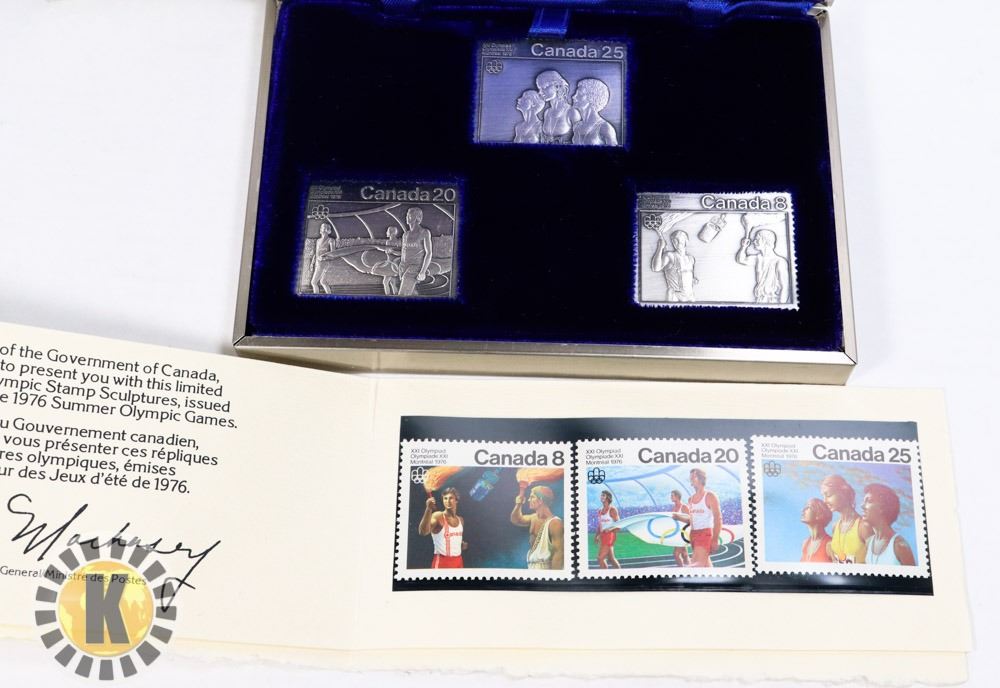 3 SILVER REPLICA STAMPS AND UNC STAMPS, rare silver 999 silver of the stamps with it, issued by the Governor of Canada Post for the Montreal Olympics in a special case and numbered.***ITEM(S) LOCATED IN LETHBRIDGE ALBERTA