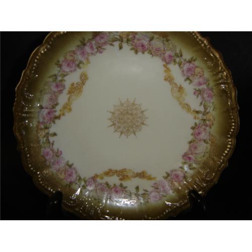 EARLY 1900'S LIMOGES PLATE, GOLD TRIM, PINK ROSES AND GOLD ESTER DESIGN IN MIDDLE. LIMOGES B & H WHICH IS BLAKEMAN AND HENDERSON /FRANCE.