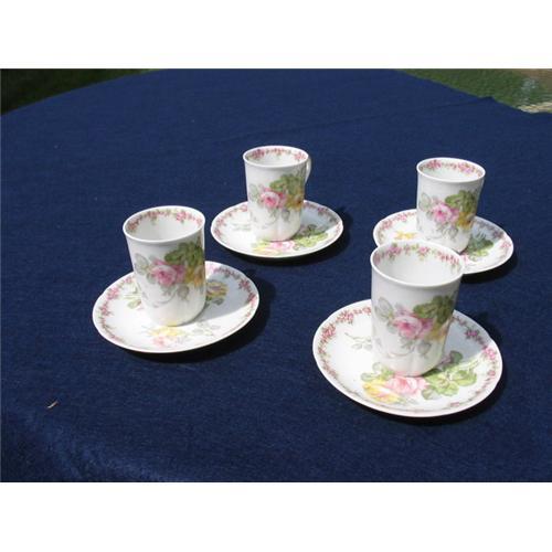 EXQUISITE SET OF 4 LIMOGES CHOCOLATE CUPS WITH SAUCERS DECORATED IN BEAUTIFUL PINK AND YELLOW ROSES. THESE CUPS ARE VERY DELICATE AND GORGEOUS.