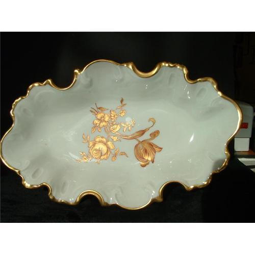 A WONDERFUL CANDY DISH FOR THE TABLE GOLD LEAFED TRIM AND BEUTIFUL DESIGN LIMOGES STAMPED ON THE BOTTOM OF DISH AND STAND