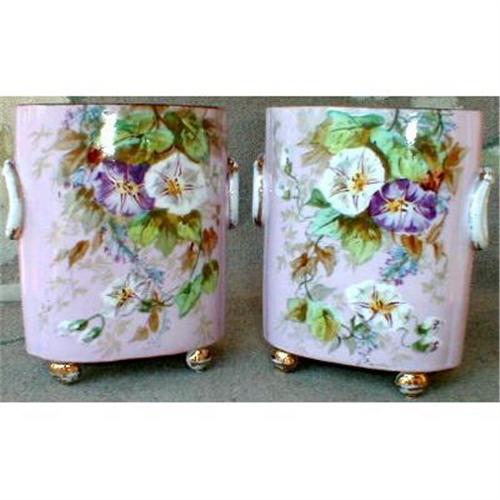 Limoges. These are wide ovals raised on 4 round feet and adorned with molded link handles. The front of each is hand painted with multicolored Morning Glories (datura) on pink background. On the back are green vines and leaves. <p>Made by William Guerin, Limoges, France. Backstamp on bottoms as shown.<p>Each measures 5-3/8 x 3-1/4 inches x 7 tall