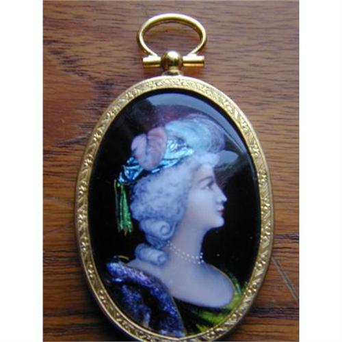 A WONDERFUL ENAMEL MINIATURE PORTRAIT WITH THE FINEST ENAMEL WORK. THERE IS AN IRREDESCENCE THAT REMINDS ONE OF BUTTERFLY WINGS.