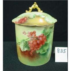 Limoges France covered condiment jar. Hand painted. Gold accent. Marked. 5-1/2" tall and 3-1/2" wide. Condition: Excellent